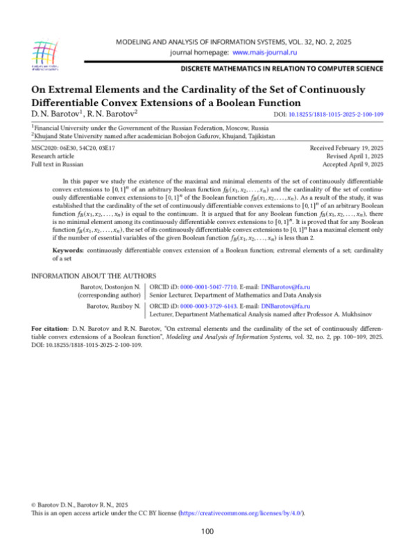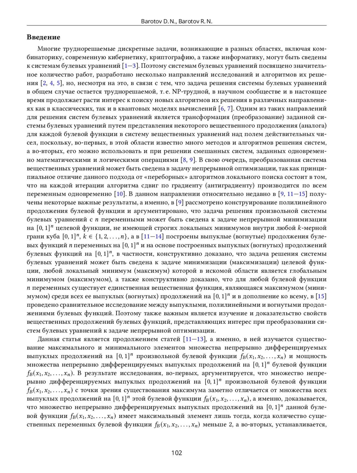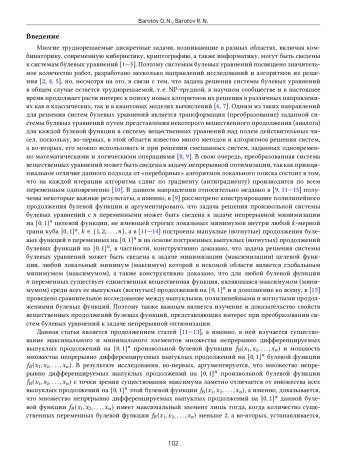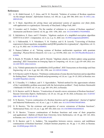 12. D. N. Barotov, “Convex continuation of a Boolean function and its applications,” Journal of Applied and Industrial Mathematics, vol. 18, no. 1, pp. 1-9, 2024, https://doi.org/10.1134/S1990478924010010.