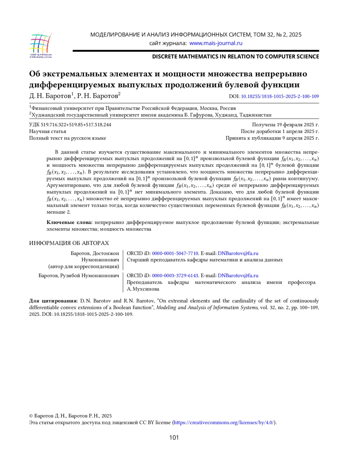 18. D. N. Barotov, “Convex continuations of some discrete functions,” Journal of Applied and Industrial Mathematics, vol. 18, no. 3, pp. 412-423, 2024, https://doi.org/10.1134/S1990478924030049.