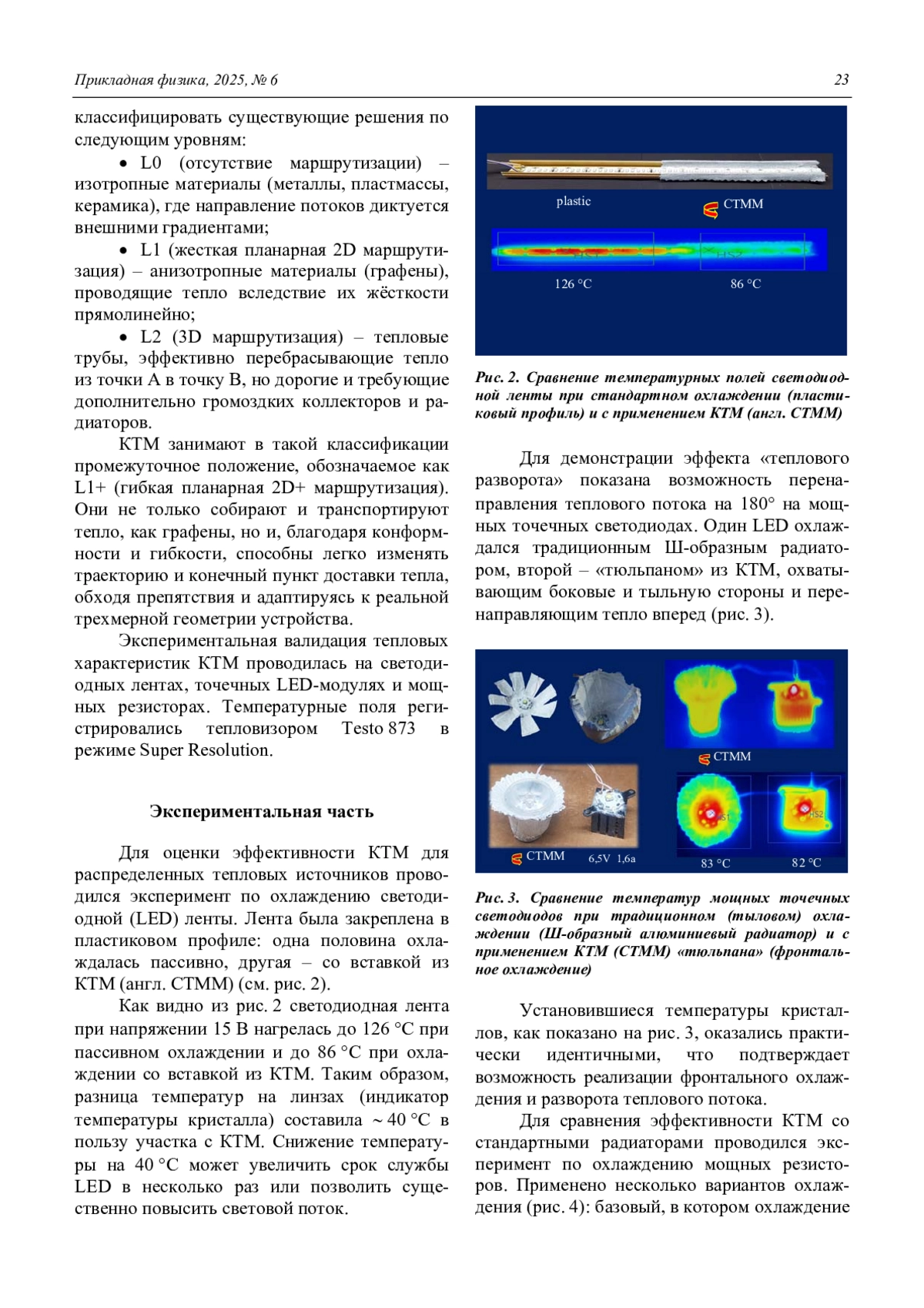 Представлены результаты разработки и валидации нового класса материалов – конформных тепловых метаматериалов (КТМ), обладающих уникальной триадой свойств: выраженной анизотропией теплопроводности (xy/z 20–30, где xy = 60– 80 Вт/(мК), z = 2–4 Вт/(мК)), обеспечивающей «тепловой разворот»; конформностью – способностью точно воспроизводить рельеф поверхностей и изгибаться до 180 для «геометрического» управления потоками; автоэффектом улучшения теплового контакта за счет микроэкструзии внутренней теплопроводящей пасты. КТМ занимают промежуточное положение между жесткими анизотропными пластинами и тепловыми трубами, сочетая их преимущества при меньшей стоимости. Валидационные эксперименты на светодиодных лентах, точечных LED-источниках и мощных резисторах показали снижение температуры кристалла на 28–45 C, что эквивалентно увеличению срока службы в 2–3 раза. Доказана возможность замены традиционных Ш-образных радиаторов на покрытия КТМ и связанного с этим радикального улучшения массогабаритных характеристик электронных устройств.