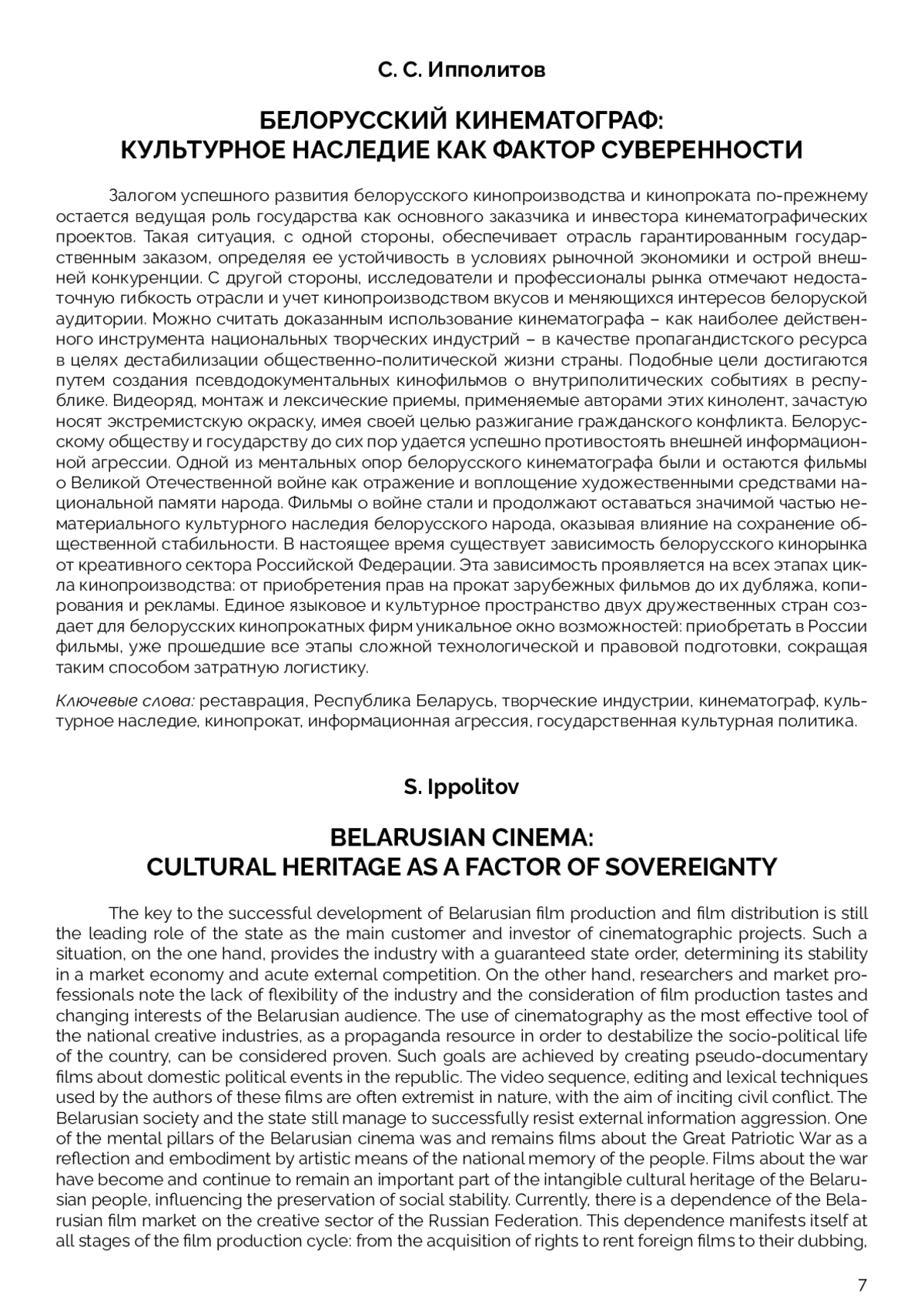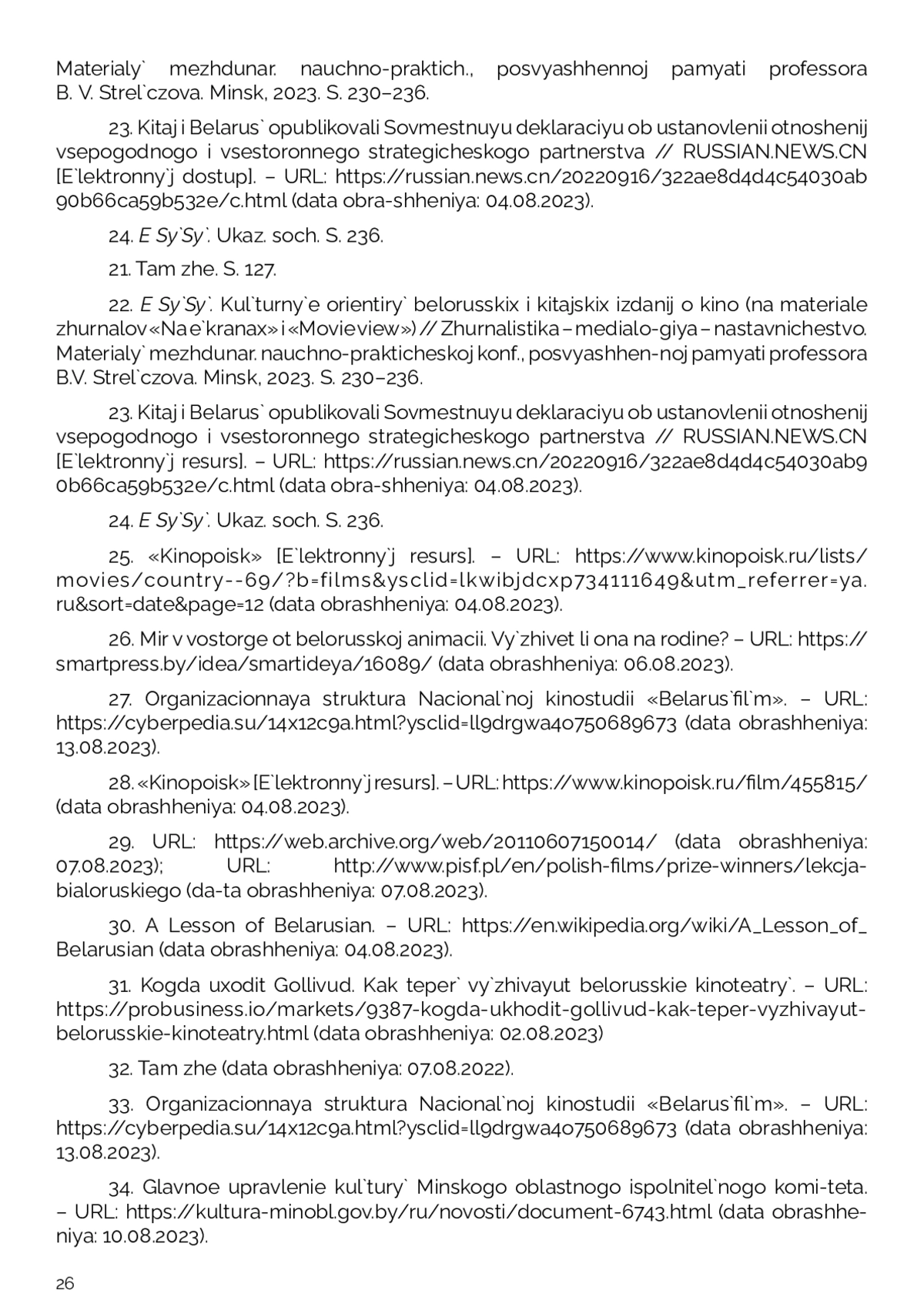 12. Агафонова Н. А. Воплощение белорусской идентичности в игровом кино 1980-2000 гг.: узловые моменты //Нацыянальны характар i спосабы яго ўвасаблення ў культуры i мове ва ўмовах мульцiкультурнага асяроддзя. Электронны зборнiк матэрыялаў II Мiжнароднай навуковай канферэнцыi. Наваполацк, 2022. С. 11-15. EDN: YJJSSJ