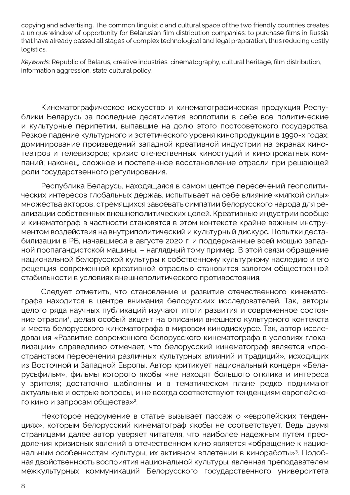 Залогом успешного развития белорусского кинопроизводства и кинопроката по-прежнему остается ведущая роль государства как основного заказчика и инвестора кинематографических проектов. Такая ситуация, с одной стороны, обеспечивает отрасль гарантированным государственным заказом, определяя ее устойчивость в условиях рыночной экономики и острой внешней конкуренции. С другой стороны, исследователи и профессионалы рынка отмечают недостаточную гибкость отрасли и учет кинопроизводством вкусов и меняющихся интересов белоруской аудитории. Можно считать доказанным использование кинематографа – как наиболее действенного инструмента национальных творческих индустрий – в качестве пропагандистского ресурса в целях дестабилизации общественно-политической жизни страны. Подобные цели достигаются путем создания псевдодокументальных кинофильмов о внутриполитических событиях в республике. Видеоряд, монтаж и лексические приемы, применяемые авторами этих кинолент, зачастую носят экстремистскую окраску, имея своей целью разжигание гражданского конфликта. Белорусскому обществу и государству до сих пор удается успешно противостоять внешней информационной агрессии. Одной из ментальных опор белорусского кинематографа были и остаются фильмы о Великой Отечественной войне как отражение и воплощение художественными средствами национальной памяти народа. Фильмы о войне стали и продолжают оставаться значимой частью нематериального культурного наследия белорусского народа, оказывая влияние на сохранение общественной стабильности. В настоящее время существует зависимость белорусского кинорынка от креативного сектора Российской Федерации. Эта зависимость проявляется на всех этапах цикла кинопроизводства: от приобретения прав на прокат зарубежных фильмов до их дубляжа, копирования и рекламы. Единое языковое и культурное пространство двух дружественных стран создает для белорусских кинопрокатных фирм уникальное окно возможностей: приобретать в России фильмы, уже прошедшие все этапы сложной технологической и правовой подготовки, сокращая таким способом затратную логистику.