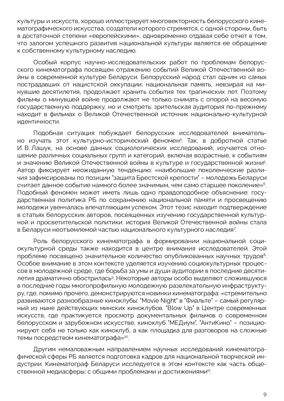 6. Адерейко Е. В. Развитие современного белорусского кинематографа в условиях глокализации //Научный поиск в сфере современной культуры и искусства. Материалы науч. конф. профессорско-преподавательского состава Белорус. гос. ун-та культуры и искусств /Редкол.: Н. В. Карчевская (пред.) [и др.]. Минск, 2021. С. 216-221. EDN: ARFWCF