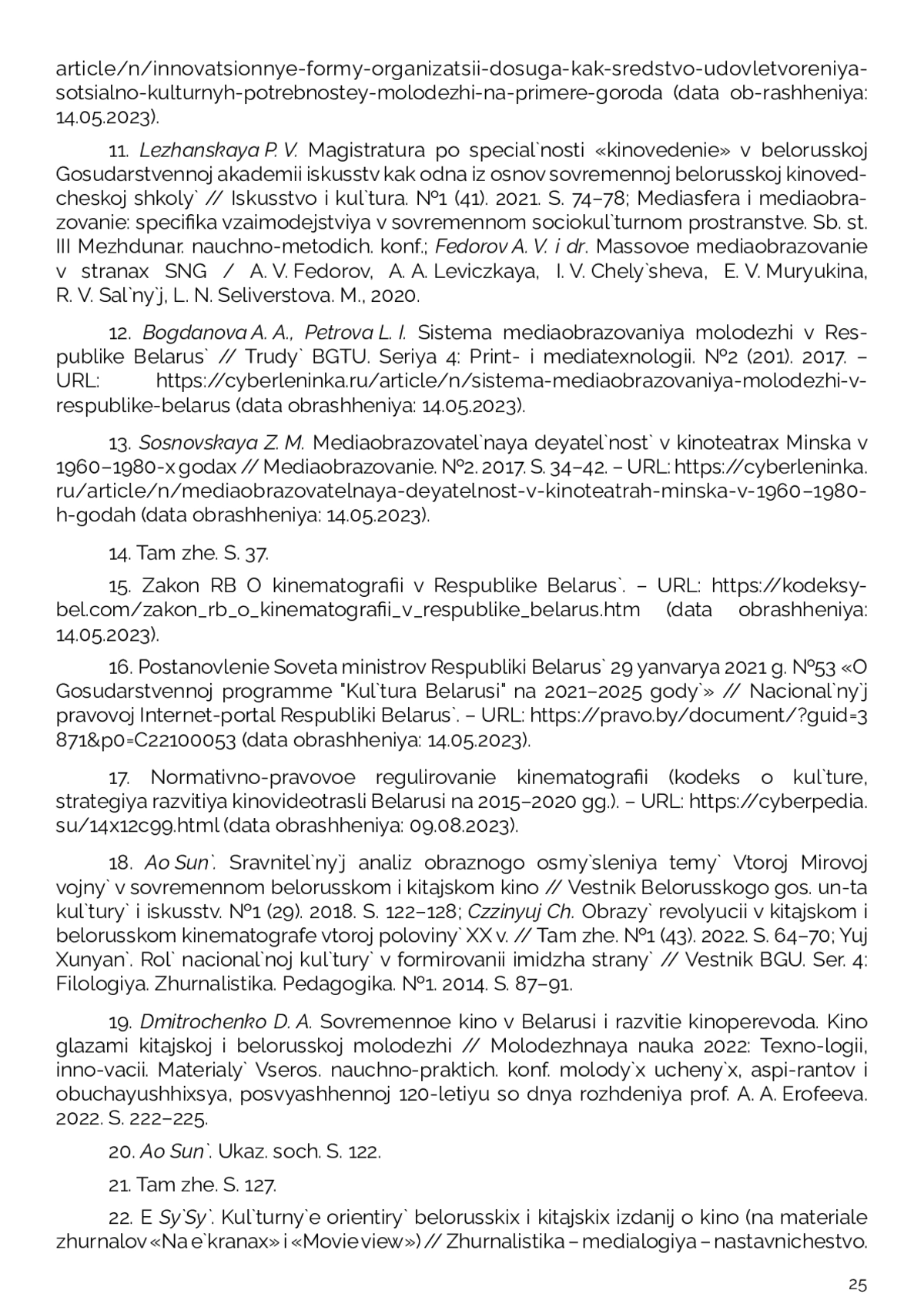 17. Лежанская П. В. Магистратура по специальности “киноведение” в белорусской Государственной академии искусств как одна из основ современной белорусской киноведческой школы //Искусство и культура. №1 (41). 2021. С. 74- 78. EDN: UOZQVT