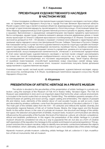 Статья посвящена особенностям презентации художественного наследия в частном собрании, на примере Музея Народного Искусства в городе Ростове Великом Ярославской области. Музей создан в 2021 году и является важным объектом, формирующим городскую культурную среду, входит в туристические маршруты, пролегающие по «Золотому кольцу». В экспозиции представлены образцы традиционной русской художественной росписи и резьбы по дереву, медного литья и вышивки. Выполненные и украшенные самодеятельными мастерами предметы крестьянского быта и интерьера, орудия труда, элементы внешнего декора сельских деревянных домов, а также иконы происходят из личного собрания ярославского коллекционера А. В. Ильина. Основная часть экспонатов датируется XVII – XX веками и отражает стилевое многообразие и характерные региональные черты народного искусства Центральной России, Сибири, Поволжья и Русского Севера. Как показывает автор, в случае частного художественного музея на структуру и дизайн экспозиционного пространства, подбор и размещение экспонатов, музейные тексты, музейную коммуникацию непосредственное влияние оказывает личность учредителя, уровень его исторической, культурологической, искусствоведческой компетентности, этические и эстетические предпочтения. В этой связи презентацию художественного наследия в частном музее следует рассматривать не только как способ популяризации изобразительного искусства, но и как форму творческого самовыражения экспозиционера, его послание окружающему миру. Такой подход обогащает музейное повествование, способствует выявлению новых смысловых связей между предметами в экспозиции, что, в конечном итоге, позволит посетителю получить более детальное представление о художественном наследии.