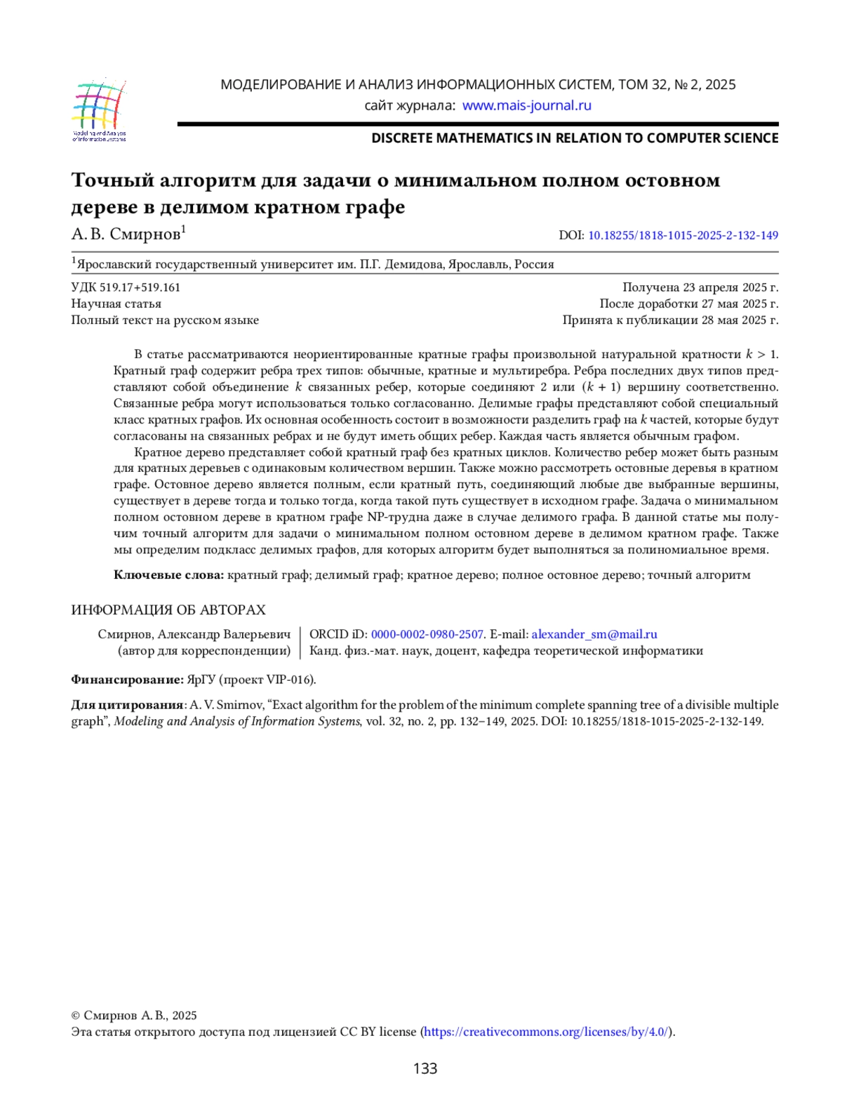 В статье рассматриваются неориентированные кратные графы произвольной натуральной кратности k > 1. Кратный граф содержит ребра трех типов: обычные, кратные и мультиребра. Ребра последних двух типов представляют собой объединение k связанных ребер, которые соединяют 2 или вершину соответственно. Связанные ребра могут использоваться только согласованно. Делимые графы представляют собой специальный класс кратных графов. Их основная особенность состоит в возможности разделить граф на k частей, которые будут согласованы на связанных ребрах и не будут иметь общих ребер. Каждая часть является обычным графом. Кратное дерево представляет собой кратный граф без кратных циклов. Количество ребер может быть разным для кратных деревьев с одинаковым количеством вершин. Также можно рассмотреть остовные деревья в кратном графе. Остовное дерево является полным, если кратный путь, соединяющий любые две выбранные вершины, существует в дереве тогда и только тогда, когда такой путь существует в исходном графе. Задача о минимальном полном остовном дереве в кратном графе NP-трудна даже в случае делимого графа. В данной статье мы получим точный алгоритм для задачи о минимальном полном остовном дереве в делимом кратном графе. Также мы определим подкласс делимых графов, для которых алгоритм будет выполняться за полиномиальное время.