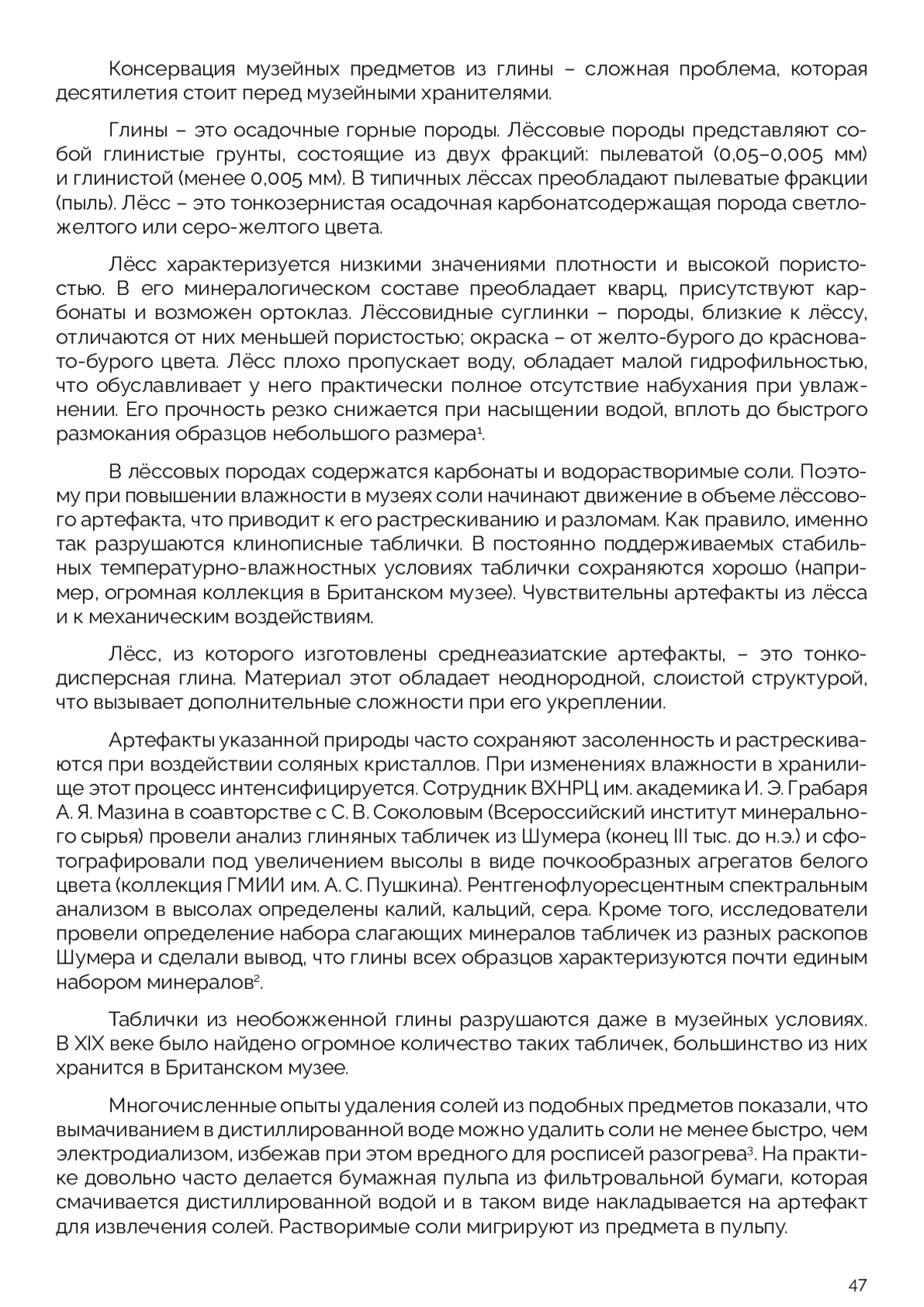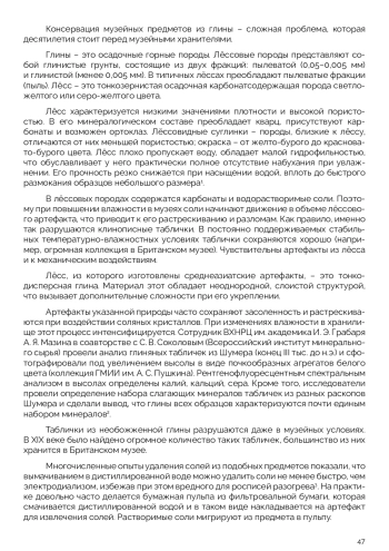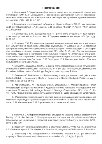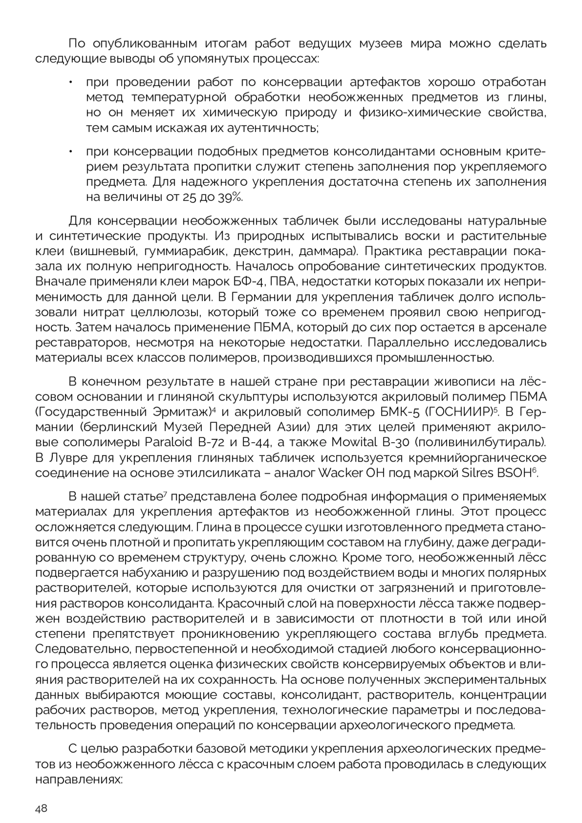 В статье рассматриваются проблемы консервации артефактов, изготовленных из необожженной глины. Описаны причины, вызывающие разрушение таких предметов. Приведена краткая история поисков подходящего укрепляющего состава для сохранения лёссовых артефактов и результат выбора этих материалов крупнейшими музеями, обладающими такими коллекциями. Изложена работа, проведенная в лаборатории химико-технологических исследований ГОСНИИР по поиску оптимального материала для укрепления подобных предметов. За основу укрепляющего состава был взят полиэтиленгликоль (ПЭГ-1500) как наиболее глубоко и равномерно проникающий в лёссовый слой объем. Для увеличения прочности ПЭГ-1500 была проведена его модификация различными полимерами: метилцеллюлозой, акриловым сополимером и поливинилбутиралем. В качестве модельных образцов использовались фрагменты живописи на лёссовом основании из раскопов Средней Азии. У образцов определяли глубину пропитки, изменение твердости, изменение цвета. В результате были отобраны два укрепляющих состава на ПЭГ-1500: с акриловым сополимером и поливинилбутиралем. Они использовались для образцов разной степени разрушения. Рассмотрены случаи укрепления лёссовых объемов с наличием красочного слоя и без него. Отработана методика очистки образцов с разной степенью плотности. Приведена таблица глубины проникания и укрепляющего действия консолиданта в зависимости от прочности глиняной основы и наличия красочного слоя.