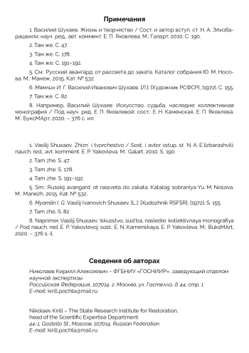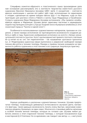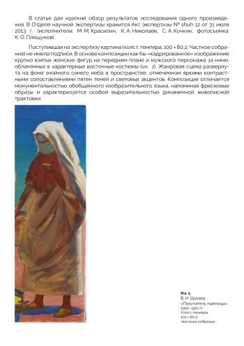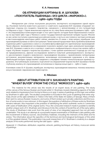 Материалом для статьи послужили результаты экспертного исследования одной картины. Изучение полотна известного русского и советского художника В. И. Шухаева открывает интересные стороны его позднего творчества, связанного с впечатлениями от его путешествия по Марокко в 1932 г. Серия живописных картин на эту тему была написана Шухаевым в 1960 – 1961 гг. Исследовавшаяся композиция входит в этот цикл картин, которые были первоначально показаны на выставке 1962 года в Тбилиси в залах Государственной картинной галереи Грузии. Многие из них затем поступили в различные российские музеи, а часть из них попала в частные коллекции и местонахождение некоторых работ сейчас неизвестно. В связи с этим вопрос атрибуции этих произведений Шухаева остается актуальным. Также важной продолжает быть проблема выявления подлинных работ художника в связи со случаями фальсификации его оригинальных произведений. Таким образом, проведенное исследование позволило выявить еще одно уникальное произведение В. И. Шухаева и ввести его в контекст советского изобразительного искусства начала 1960-х годов. Изучение позднего творчества Шухаева с точки зрения комплексного подхода до сих пор не предпринималось. Данное исследование является попыткой целенаправленного экспертного рассмотрения позднего живописного произведения Шухаева с привлечением литературных источников, документальных материалов, включающих воспоминания художника и его вдовы. Наибольший интерес представляют сведения о специфике технико-технологических приемов художника. Эта публикация, возможно, подтолкнет исследователей творчества В. И. Шухаева к более глубокому анализу его произведений, исполненных в период конца 1940-х – 1960-х годов.