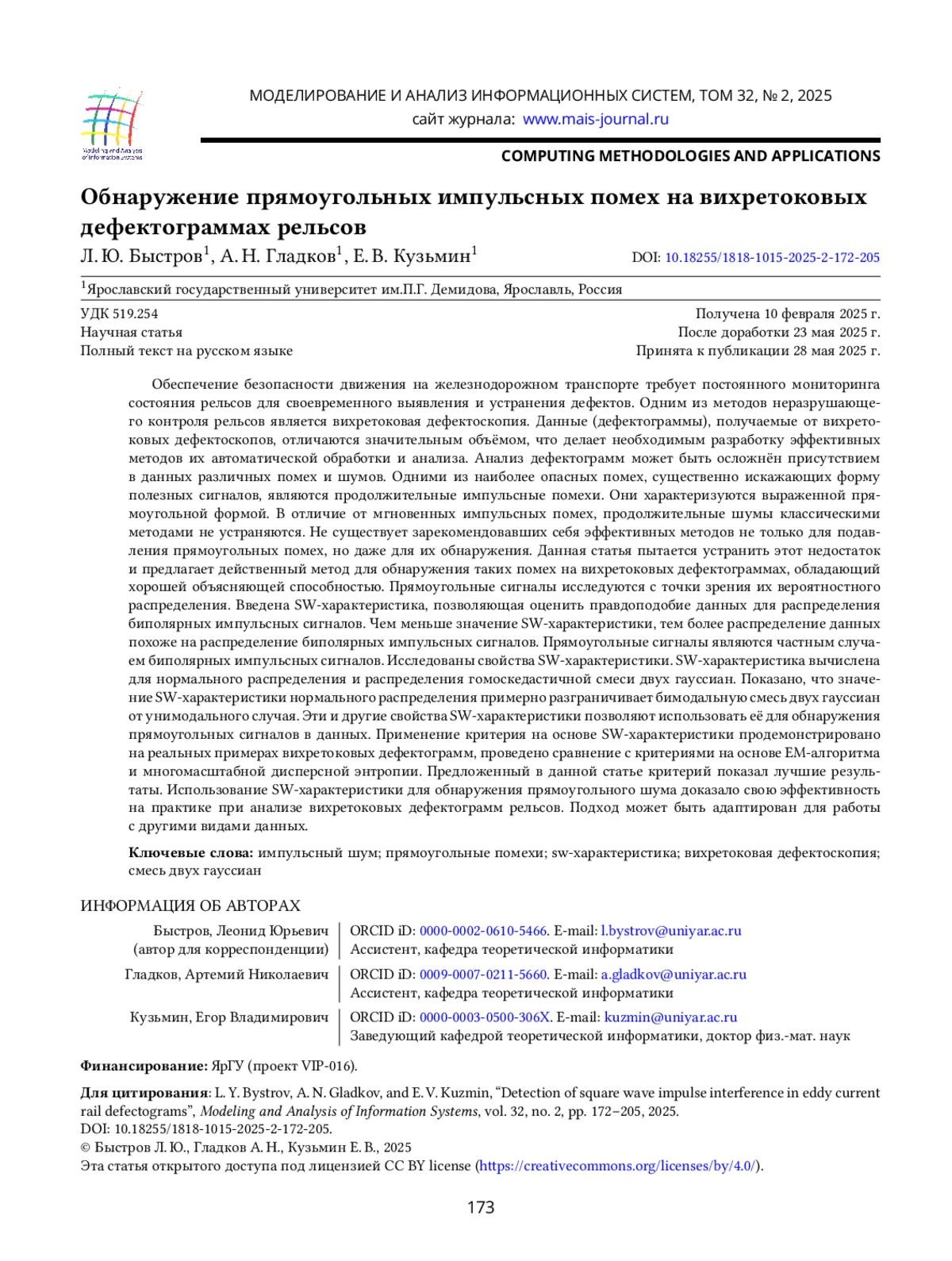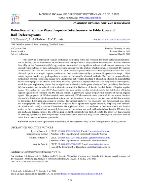 5. L. Y. Bystrov, A. N. Gladkov, and E. V. Kuzmin, “Suppression of additive periodic low-frequency interference on eddy current defectograms,” Modeling and Analysis of Information Systems, vol. 31, no. 2, pp. 164-181, 2024, https://doi.org/10.18255/1818-1015-2024-2-164-181.
