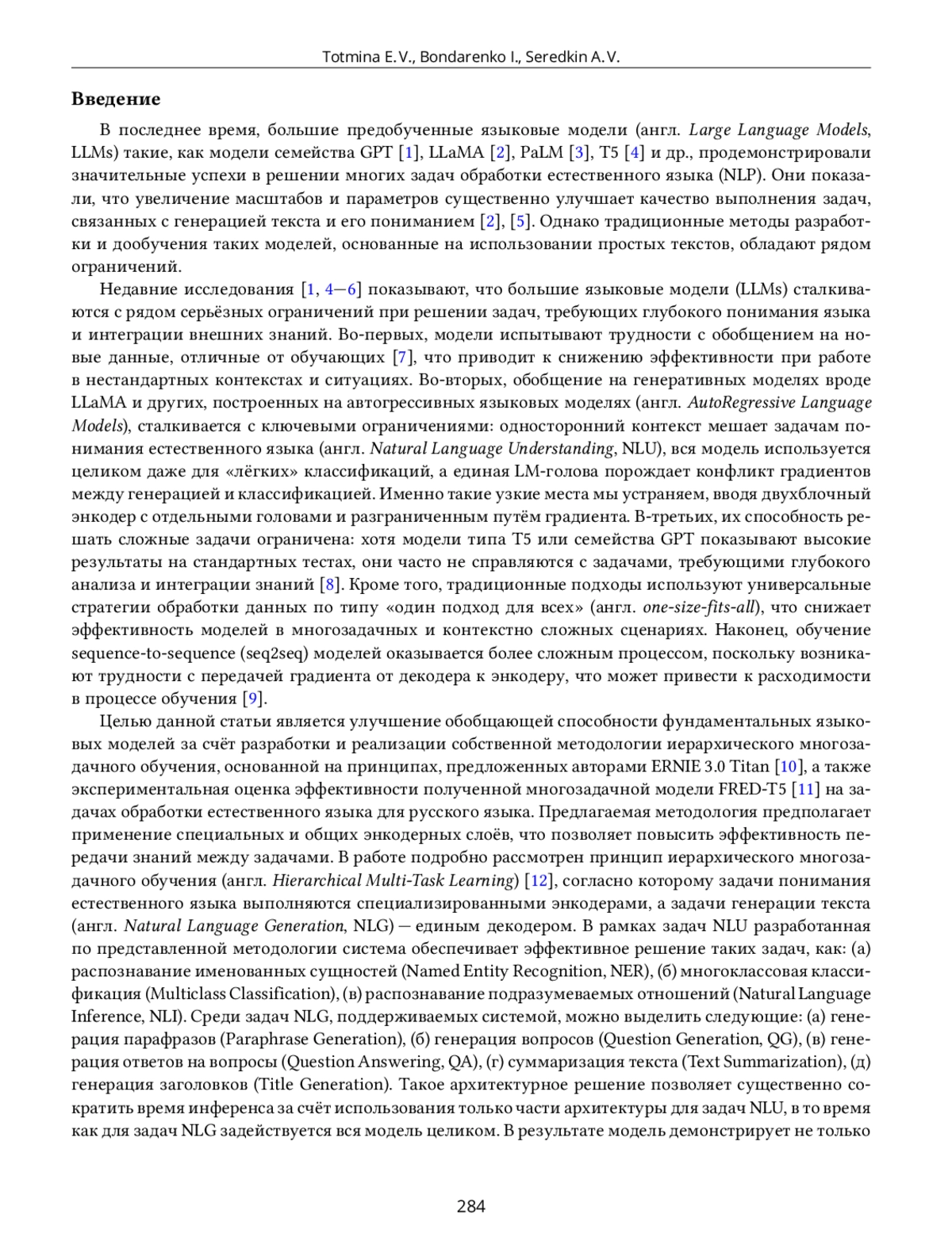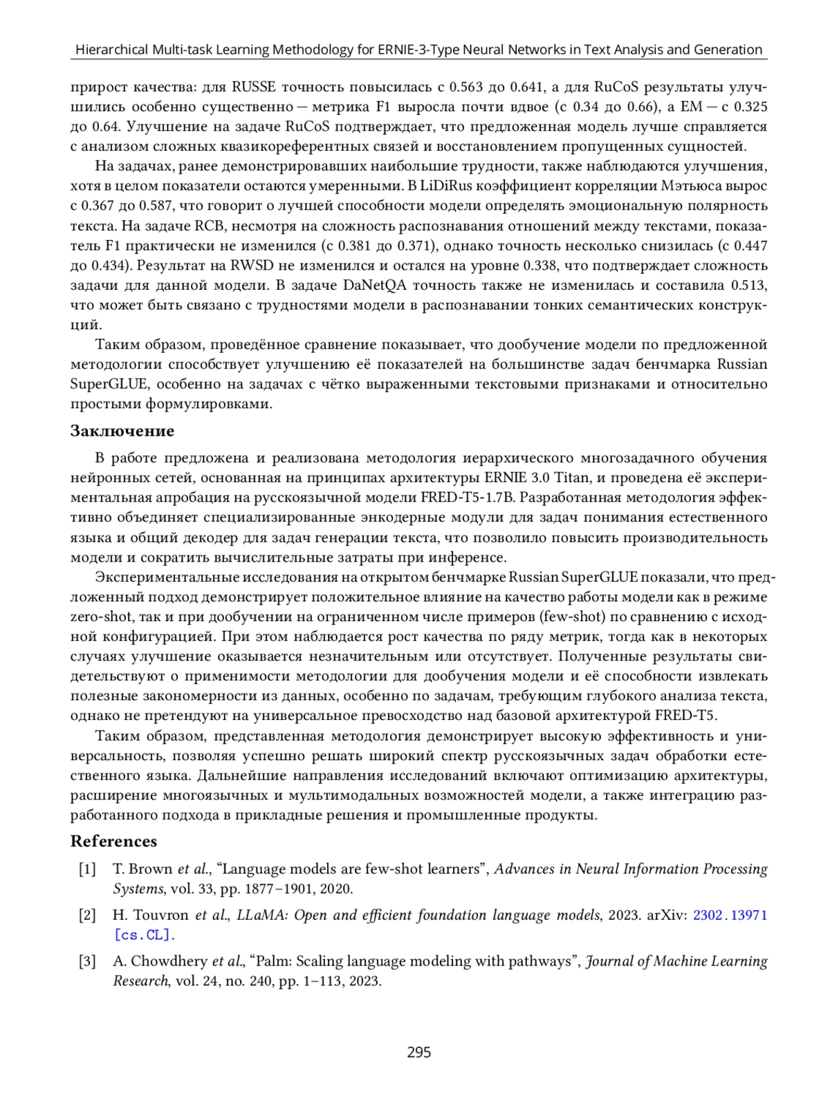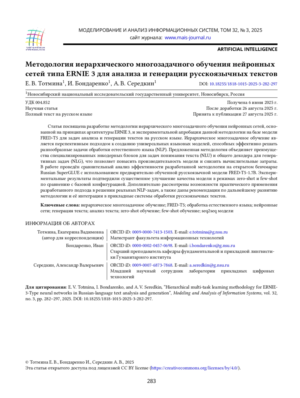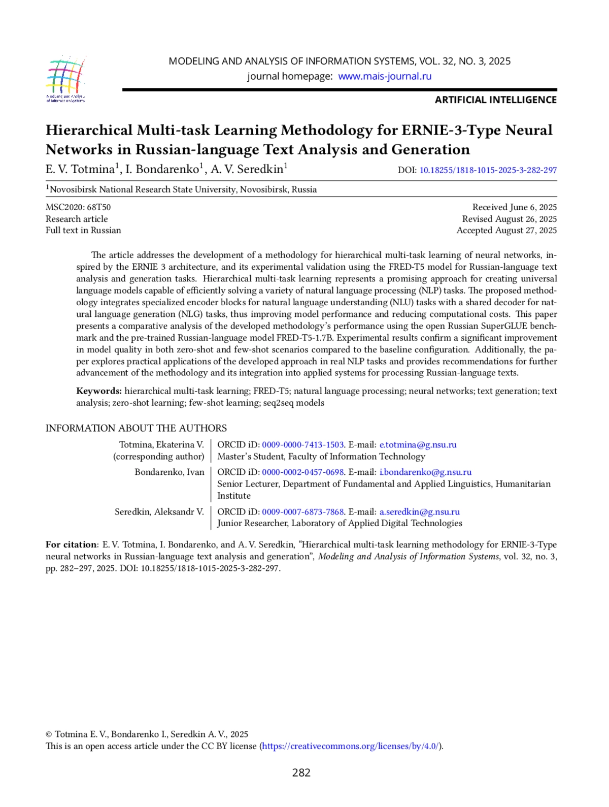 Статья посвящена разработке методологии иерархического многозадачного обучения нейронных сетей, основанной на принципах архитектуры ERNIE 3, и экспериментальной апробации данной методологии на базе модели FRED-T5 для задач анализа и генерации текстов на русском языке. Иерархическое многозадачное обучение является перспективным подходом к созданию универсальных языковых моделей, способных эффективно решать разнообразные задачи обработки естественного языка (NLP). Предложенная методология объединяет преимущества специализированных энкодерных блоков для задач понимания текста (NLU) и общего декодера для генеративных задач (NLG), что позволяет повысить производительность модели и снизить вычислительные затраты. В работе проведён сравнительный анализ эффективности разработанной методологии на открытом бенчмарке Russian SuperGLUE с использованием предварительно обученной русскоязычной модели FRED-T5-1.7B. Экспериментальные результаты подтвердили существенное улучшение качества модели в режимах zero-shot и few-shot по сравнению с базовой конфигурацией. Дополнительно рассмотрены возможности практического применения разработанного подхода в решении реальных NLP-задач, а также даны рекомендации по дальнейшему развитию методологии и её интеграции в прикладные системы обработки русскоязычных текстов.