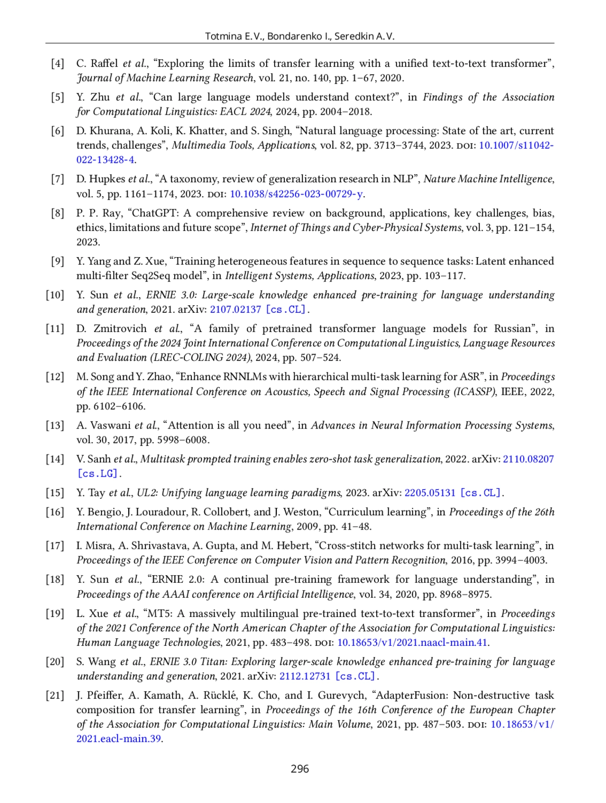 онцепция многозадачного обучения (англ. Multi-Task Learning, MTL) рассматривает параллельное формирование модели на совокупности задач с целью индуктивного переноса знаний и повышения обобщающей способности алгоритма [1]. Фундамент современных языковых моделей составляют трансформеры, впервые описанные в работе [13]; ключевой их компонент — механизм самовнимания (англ. self-attention), обеспечивающий извлечение глобальных зависимостей и формирование контекстно-чувствительных представлений текста.
