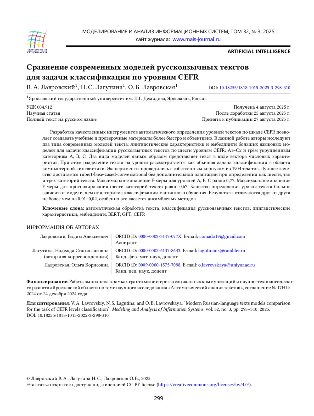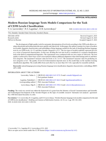 17. N. Lagutina, K. Lagutina, A. Brederman, and N. Kasatkina, “Text classification by CEFR levels using machine learning methods and BERT language model,” Modeling and Analysis of Information Systems, vol. 30, no. 3, pp. 202-213, 2023, https://doi.org/10.18255/1818-1015-2023-3-202-213.