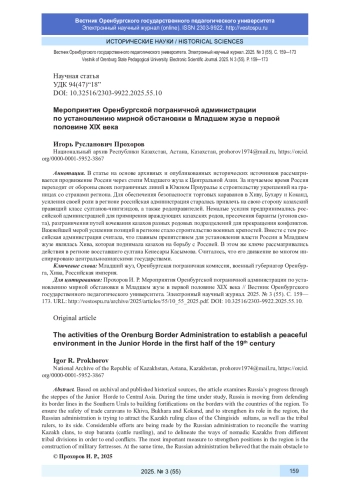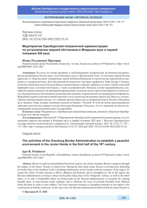 В статье на основе архивных и опубликованных исторических источников рассматривается продвижение России через степи Младшего жуза к Центральной Азии. За изучаемое время Россия переходит от обороны своих пограничных линий в Южном Приуралье к строительству укреплений на границах со странами региона. Для обеспечения безопасности торговых караванов в Хиву, Бухару и Коканд, усиления своей роли в регионе российская администрация старалась привлечь на свою сторону казахский правящий класс султанов-чингизидов, а также родоправителей. Немалые усилия предпринимались российской администрацией для примирения враждующих казахских родов, пресечения баранты (угонов скота), разграничения путей кочевания казахов разных родовых подразделений для прекращения конфликтов. Важнейшей мерой усиления позиций в регионе стало строительство военных крепостей. Вместе с тем российская администрация считала, что главным препятствием для установления власти России в Младшем жузе являлась Хива, которая поднимала казахов на борьбу с Россией. В этом же ключе рассматривались действия в регионе восставшего султана Кенесары Касымова. Считалось, что его движение во многом инспирировано центральноазиатскими государствами.