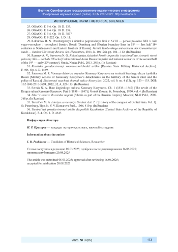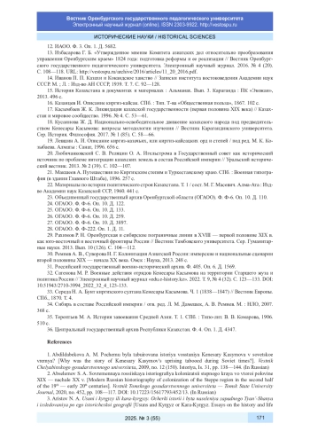 2. Абселемов С. А. Современная российская историография колонизации степного края во второй половине XIX - начале XX в. // Вестник Томского государственного университета. 2020. № 452. С. 108-117. DOI: 10.17223/15617793/452/13