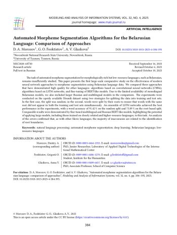 19. D. Morozov, T. Garipov, O. Lyashevskaya, S. Savchuk, B. Iomdin, and A. Glazkova, “Automatic Morpheme Segmentation for Russian: Can an Algorithm Replace Experts?,” Journal of Language and Education, vol. 10, no. 4, pp. 71-84, 2024, https://doi.org/10.17323/jle.2024.22237.