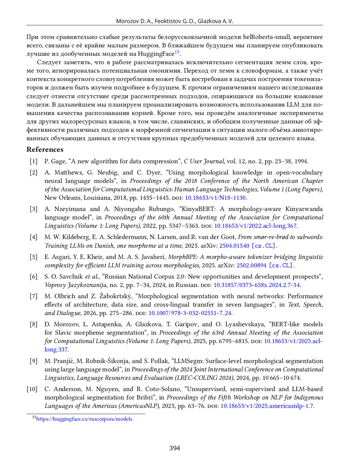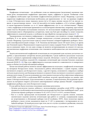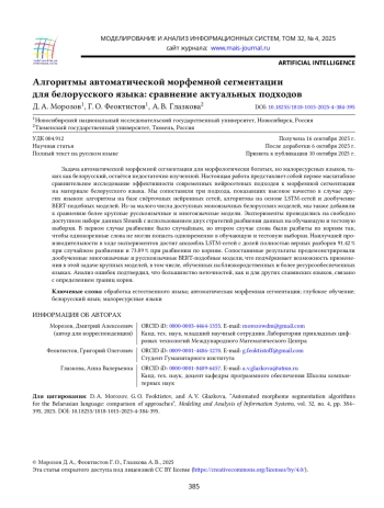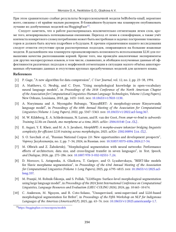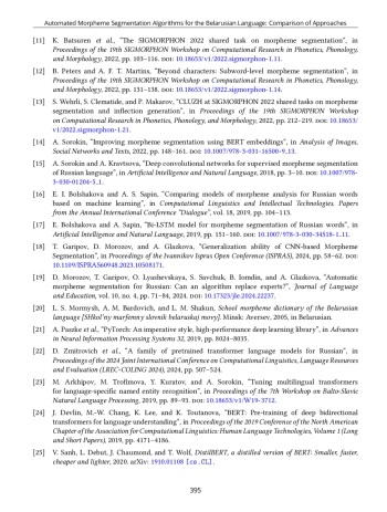 8. D. Morozov, L. Astapenka, A. Glazkova, T. Garipov, and O. Lyashevskaya, “BERT-like Models for Slavic Morpheme Segmentation,” in Proceedings of the 63rd Annual Meeting of the Association for Computational Linguistics (Volume 1: Long Papers), 2025, pp. 6795-6815, https://doi.org/10.18653/v1/2025.acl-long.337.