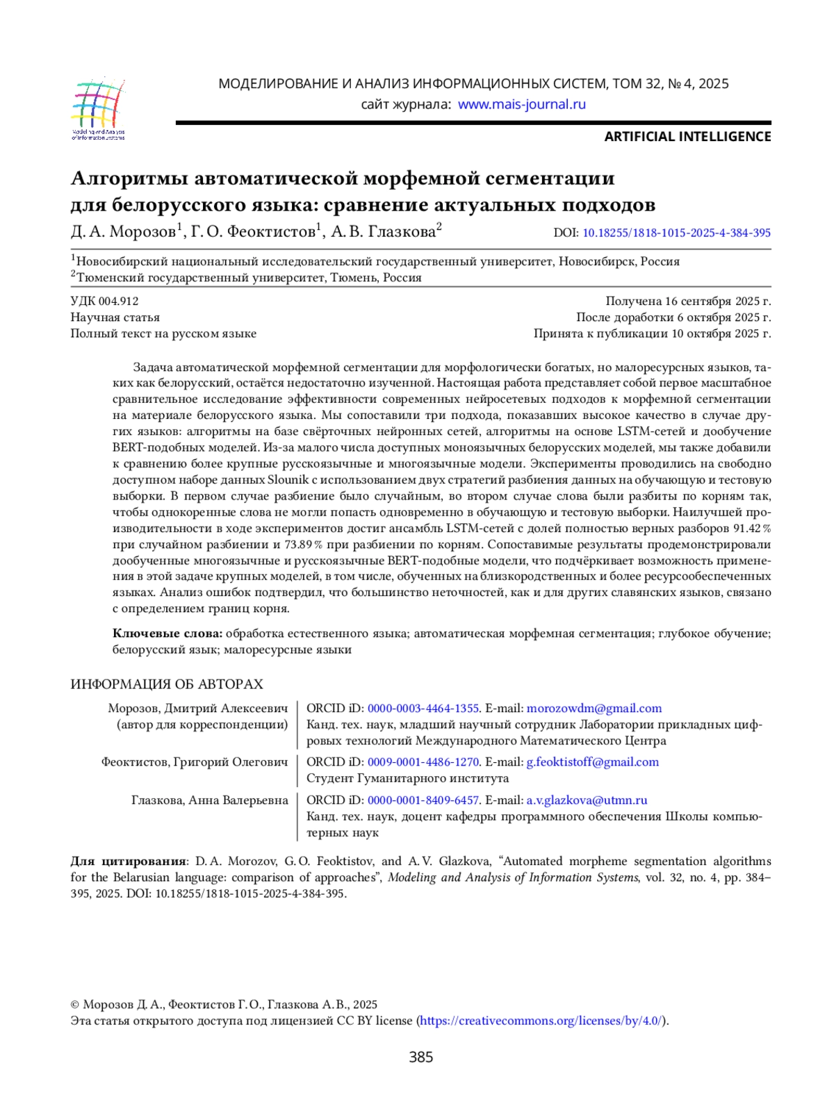 18. T. Garipov, D. Morozov, and A. Glazkova, “Generalization ability of CNN-based Morpheme Segmentation,” in Proceedings of the Ivannikov Ispras Open Conference (ISPRAS), 2024, pp. 58-62, https://doi.org/10.1109/ISPRAS60948.2023.10508171.
