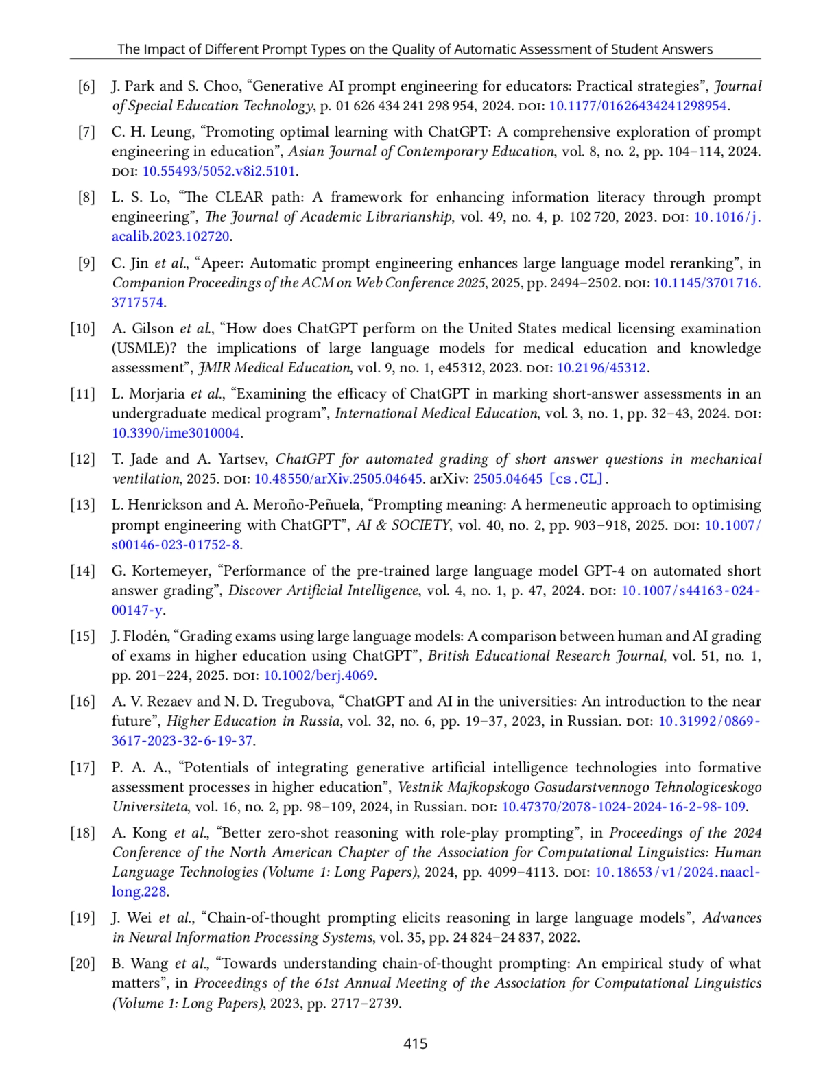 15. J. Flod’en, “Grading exams using large language models: A comparison between human and AI grading of exams in higher education using ChatGPT,” British Educational Research Journal, vol. 51, no. 1, pp. 201-224, 2025, https://doi.org/10.1002/berj.4069.