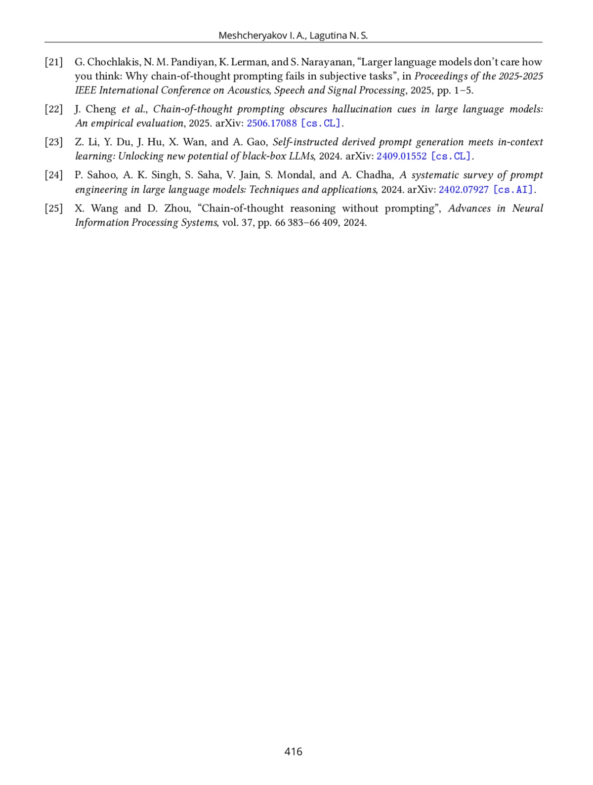 21. G. Chochlakis, N. M. Pandiyan, K. Lerman, and S. Narayanan, “Larger language models don’t care how you think: Why chain-of-thought prompting fails in subjective tasks,” in Proceedings of the 2025-2025 IEEE International Conference on Acoustics, Speech and Signal Processing, 2025, pp. 1-5.