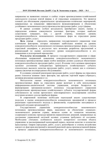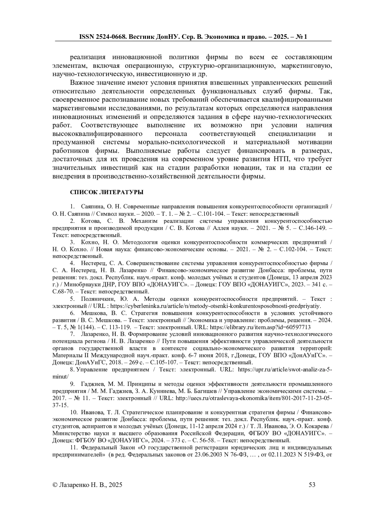 4. Нестерец, С. А. Совершенствование системы управления конкурентоспособностью фирмы / С. А. Нестерец, Н. В. Лазаренко // Финансово-экономическое развитие Донбасса: проблемы, пути решения: тез. докл. Республик. науч.-практ. конф. молодых учёных и студентов (Донецк, 13 апреля 2023 г.) / Минобрнауки ДНР, ГОУ ВПО “ДОНАУИГС”. - Донецк: ГОУ ВПО “ДОНАУИГС”, 2023. - 341 с. - С.68-70. - Текст: непосредственный.