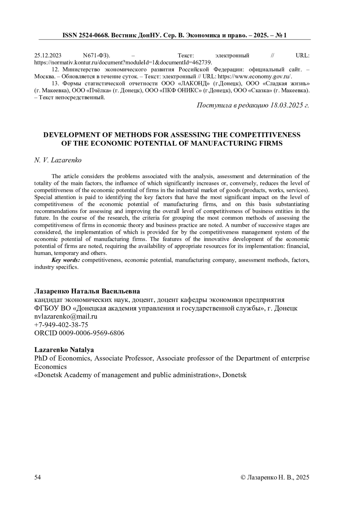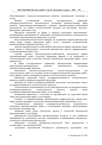 7. Лазаренко, Н. В. Формирование условий инновационного развития научно-технологического потенциала региона / Н. В. Лазаренко // Пути повышения эффективности управленческой деятельности органов государственной власти в контексте социально-экономического развития территорий: Материалы II Международной науч.-практ. конф. 6-7 июня 2018, г. Донецк, ГОУ ВПО “ДонАУиГС”. - Донецк: ДонАУиГС, 2018. - 269 с. - С.105-107. - Текст: непосредственный.