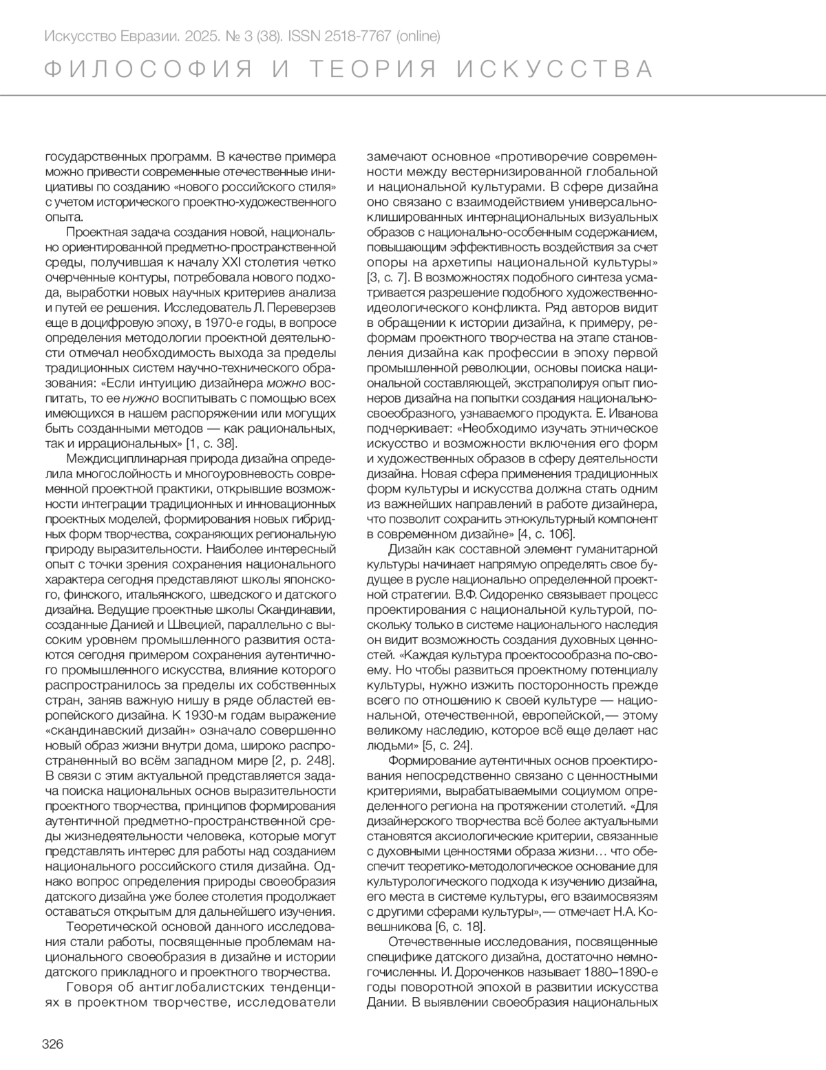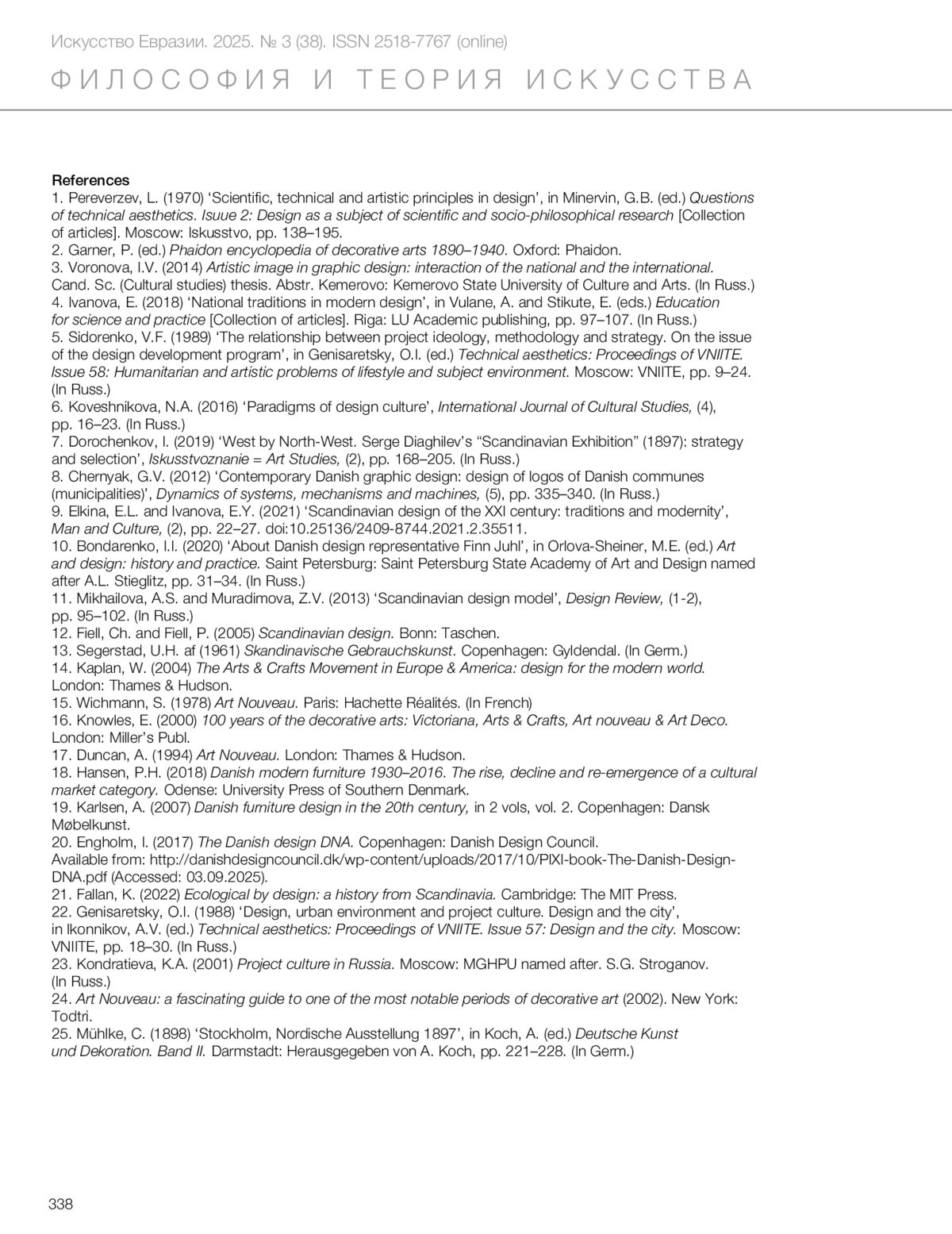 9. Elkina, E.L. and Ivanova, E.Y. (2021) ‘Scandinavian design of the XXI century: traditions and modernity’, *Man and Culture*, (2), pp. 22–27. doi:10.25136/2409-8744.2021.2.35511.