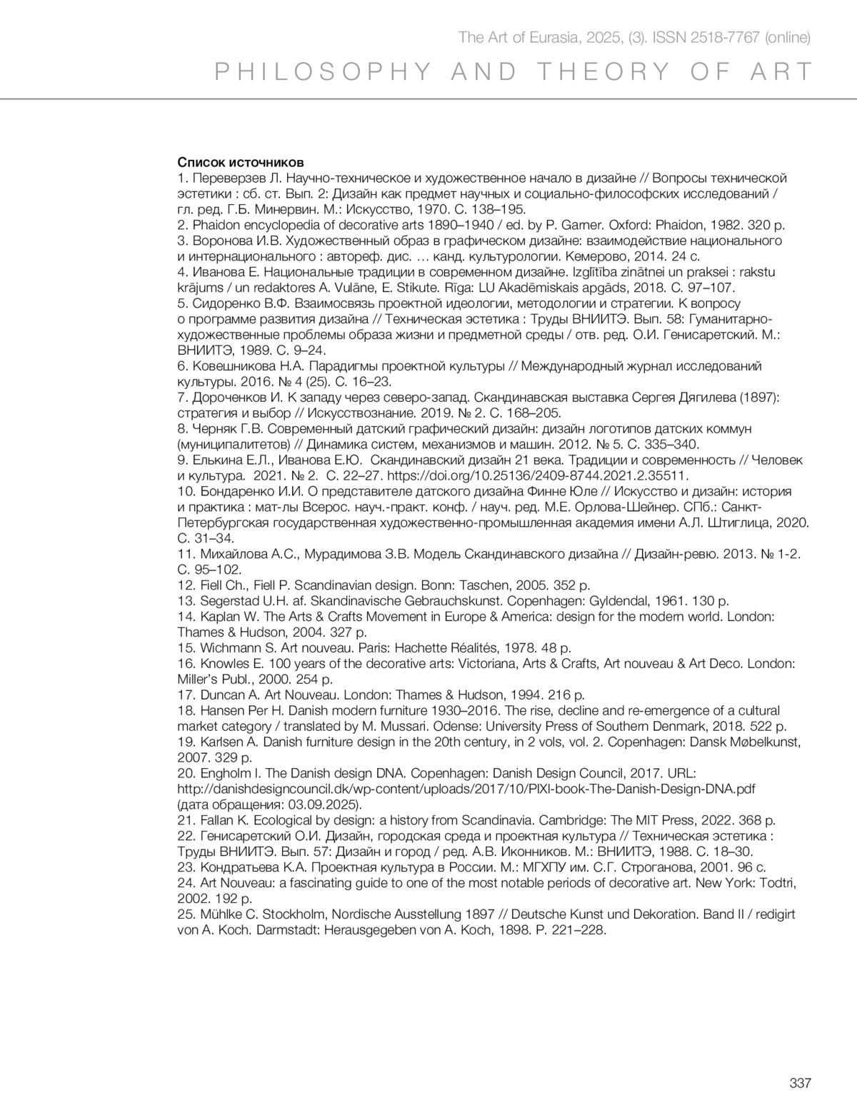 9. Елькина Е.Л., Иванова Е.Ю. Скандинавский дизайн XXI века. Традиции и современность // Человек и культура. 2021. № 2. С. 22–27. DOI: 10.25136/2409-8744.2021.2.35511. EDN: IHVZMV