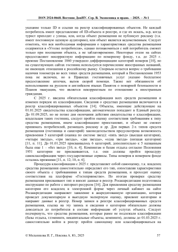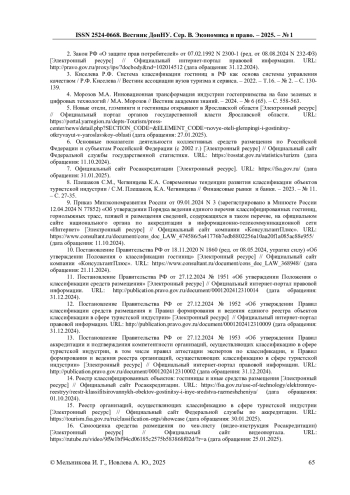 9. Приказ Минэкономразвития России от 09.01.2024 N 3 (зарегистрировано в Минюсте России 12.04.2024 N 77852) “Об утверждении Порядка ведения единого перечня классифицированных гостиниц, горнолыжных трасс, пляжей и размещения сведений, содержащихся в таком перечне, на официальном сайте национального органа по аккредитации в информационно-телекоммуникационной сети “Интернет” [Электронный ресурс] // Официальный сайт компании “КонсультантПлюс”. URL: https://www.consultant.ru/document/cons_doc_LAW_474586/5a41776b7edb8802256a10aa20f1a085ac88e955/(дата обращения: 11.10.2024).