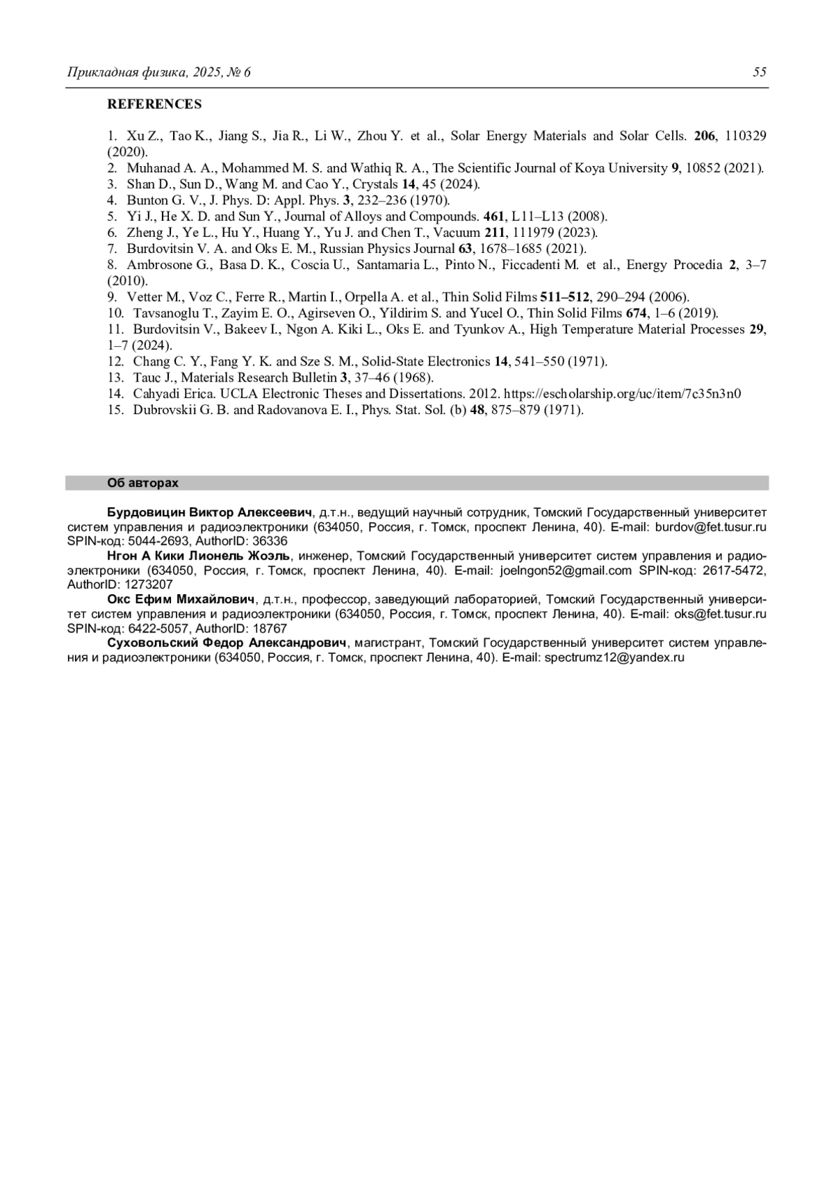 The summary list of the articles published in Applied Physics (Prikladnaya Fizika) in 2025 82