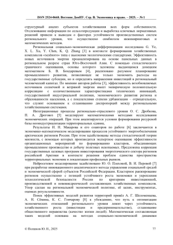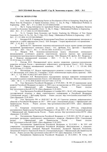 7. Плехова Ю.О. Инновационный метод анализа управления социально-экономическим развитием регионов России с применением нейросетевого моделирования [Текст] / Ю.О. Плехова, В.И. Перова // Вопросы инновационной экономики. - 2025. - Т. 15, № 1. - С. 125-144. DOI: 10.18334/vinec.15.1.122530 EDN: LHRJVC