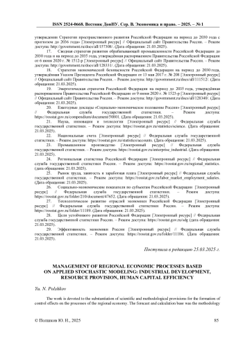 Исследование посвящено обоснованию научно-методических положений по формированию управляющих воздействий на процессы региональной экономики. Прогнозно-расчётной базой выступила методология математической теории случайных функций. Подтверждена авторская гипотеза о ключевой роли промышленного роста, ресурсообеспечения и человеческого капитала в эффективном пространственном развитии территориальных субъектов Российской Федерации, которое адекватно моделируется предложенными стохастическими методами прикладной направленности. В качестве необходимых составляющих пространственного развития охарактеризованы транспортная инфраструктура, топливно-энергетический комплекс, жилищное строительство и жилищно-коммунальное хозяйство, социальная сфера, информационно-телекоммуникационная инфраструктура и отрасль связи, экология, природопользование и климатические условия, туризм и рекреация, причём в качестве элемента научной новизны выделена перманентно модернизирующаяся система продуцирования научно-образовательных услуг. Кратко очерчены перспективы дальнейшей дискуссии применительно к экономике Донецкой Народной Республики.