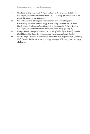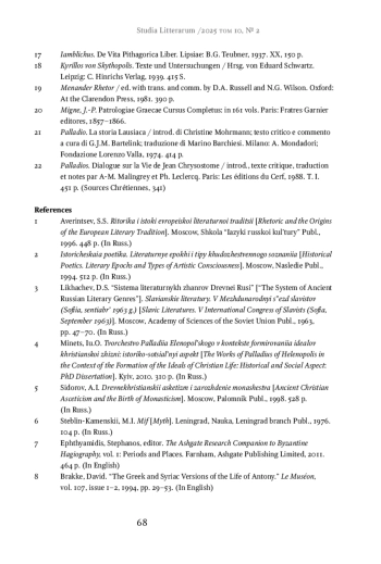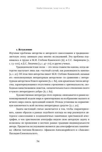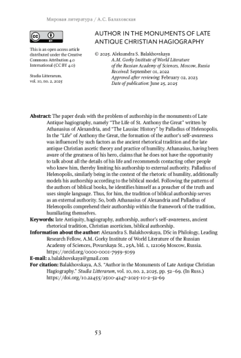 The paper deals with the problem of authorship in the monuments of Late Antique hagiography, namely “The Life of St. Anthony the Great” written by Athanasius of Alexandria, and “The Lausiac History” by Palladius of Helenopolis. In the “Life” of Anthony the Great, the formation of the author’s self-awareness was influenced by such factors as the ancient rhetorical tradition and the late antique Christian ascetic theory and practice of humility. Athanasius, having been aware of the greatness of his hero, claims that he does not have the opportunity to talk about all the details of his life and recommends contacting other people who knew him, thereby limiting his authorship to external authority. Palladius of Helenopolis, similarly being in the context of the rhetoric of humility, additionally models his authorship according to the biblical model. Following the patterns of the authors of biblical books, he identifies himself as a preacher of the truth and uses simple language. Thus, for him, the tradition of biblical authorship serves as an external authority. So, both Athanasius of Alexandria and Palladius of Helenopolis comprehend their authorship within the framework of the tradition, humiliating themselves.