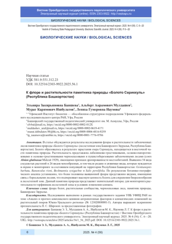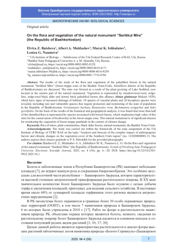 В статье обсуждаются результаты исследования флоры и растительности заболоченных лесов памятника природы «Болото Сериккуль» (лесостепная зона Башкирского Зауралья, Республика Башкортостан). Болото образовалось в результате зарастания озера Сериккуль, находящегося в восточной части памятника природы. Растительность представлена лабазниково-тростниковыми, осоково-папоротниковыми и осоково-тростниковыми черноольховыми и пушистоберезовыми заболоченными лесами (союз Alnion glutinosae Malcuit 1929), имеющими признаки дренированности местообитаний. Выявлено 54 вида сосудистых растений и 26 видов мохообразных, в том числе редкие и уязвимые виды, которые нуждаются в охране и мониторинге за состоянием популяций на территории Республики Башкортостан: Gentianopsis barbata, Ranunculus rioni, Beckmannia sysigachne и Salix pyrolifolia. По результатам ботанико-географического анализа установлено, что более половины выявленной флоры представлено видами, имеющими связь с бореальными лесами, что подчеркивает высокую ценность болота для сохранения биоразнообразия в лесостепной зоне. Данный памятник природы представляет значительный интерес для мониторинга растительности торфяников лесостепной зоны в условиях изменения климата.