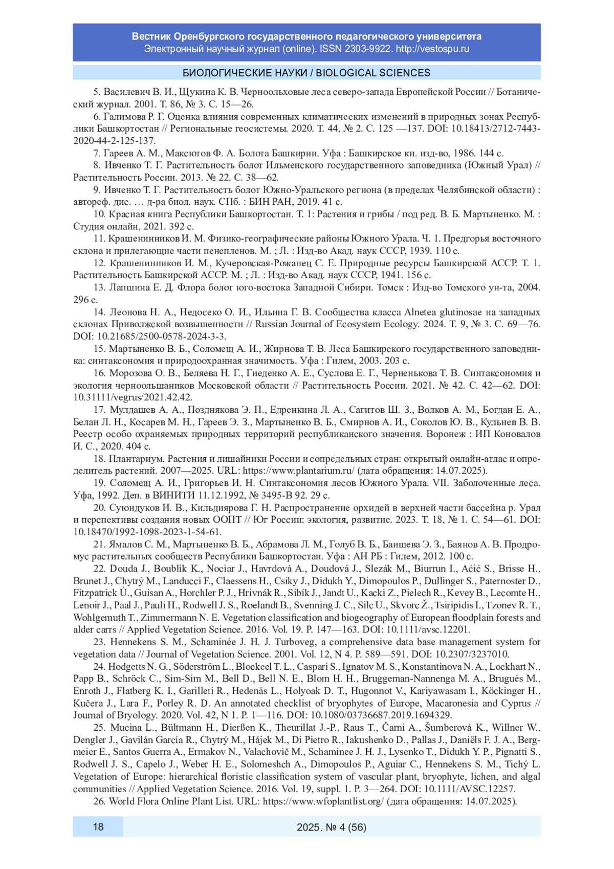 3. Бикбаев И. Г., Мартыненко В. Б., Широких П. С., Мулдашев А. А., Баишева Э. З., Минаева Т. Ю., Сирин А. А. Сообщества класса Alnetea glutinosae в Южно-Уральском регионе // Известия Самарского научного центра Российской академии наук. 2017. Т. 19, № 2. С. 110-120. EDN: ZWPZTN