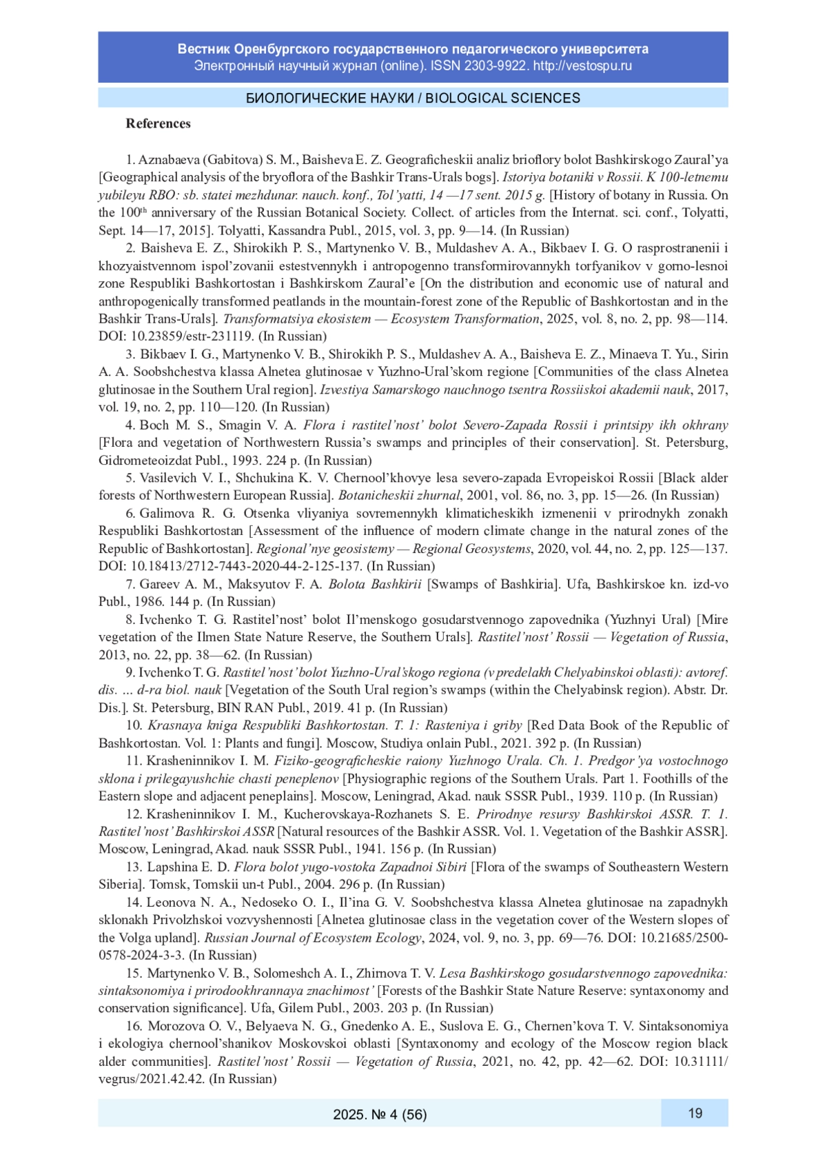 2. Баишева Э. З., Широких П. С., Мартыненко В. Б., Мулдашев А. А., Бикбаев И. Г. О распространении и хозяйственном использовании естественных и антропогенно трансформированных торфяников в горно-лесной зоне Республики Башкортостан и Башкирском Зауралье // Трансформация экосистем. 2025. Т. 8, № 2. С. 98-114. DOI: 10.23859/estr-231119 EDN: OQPESE