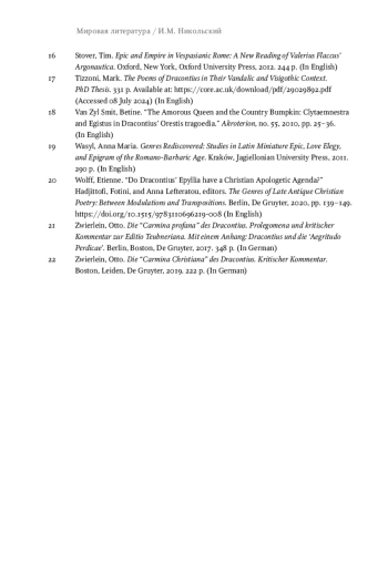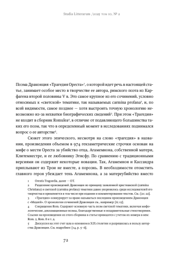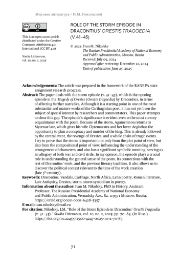 Статье рассматривается начальный эпизод «Трагедии Ореста» Драконция со штормом (ст. 41-45) с точки зрения влияния на дальнейший ход повествования. Хотя речь идет о завязке сюжета в одном из крупнейших и наиболее зрелых произведений карфагенского поэта, это место до сих пор не становилось предметом специального интереса со стороны исследователей и комментаторов. В работе предпринимается попытка закрыть этот пробел. Значимость эпизода очевидна даже при самом беглом знакомстве с поэмой. Из-за шторма Агамемнон возвращается в Микены с опозданием, что дает возможность его жене Клитемнестре и ее любовнику Эгисфу спланировать заговор и убийство царя. За этим следует уже центральное событие, месть Ореста, и целая цепь трагических событий. Я пытаюсь доказать, что шторм важен не только с сюжетной, но и с композиционной точки зрения, влияя на понимание расстановки персонажей, а также имеет важный символический смысл, служа аллегорией одновременно войны и смуты. На мой взгляд, эпизод играет важную роль для понимания общего смысла поэмы, ее связей с остальным творчеством Драконция и предыдущей литературной традицией, а также позволяет обнаружить актуальный для времени создания произведения (конец V в.) политический контекст.