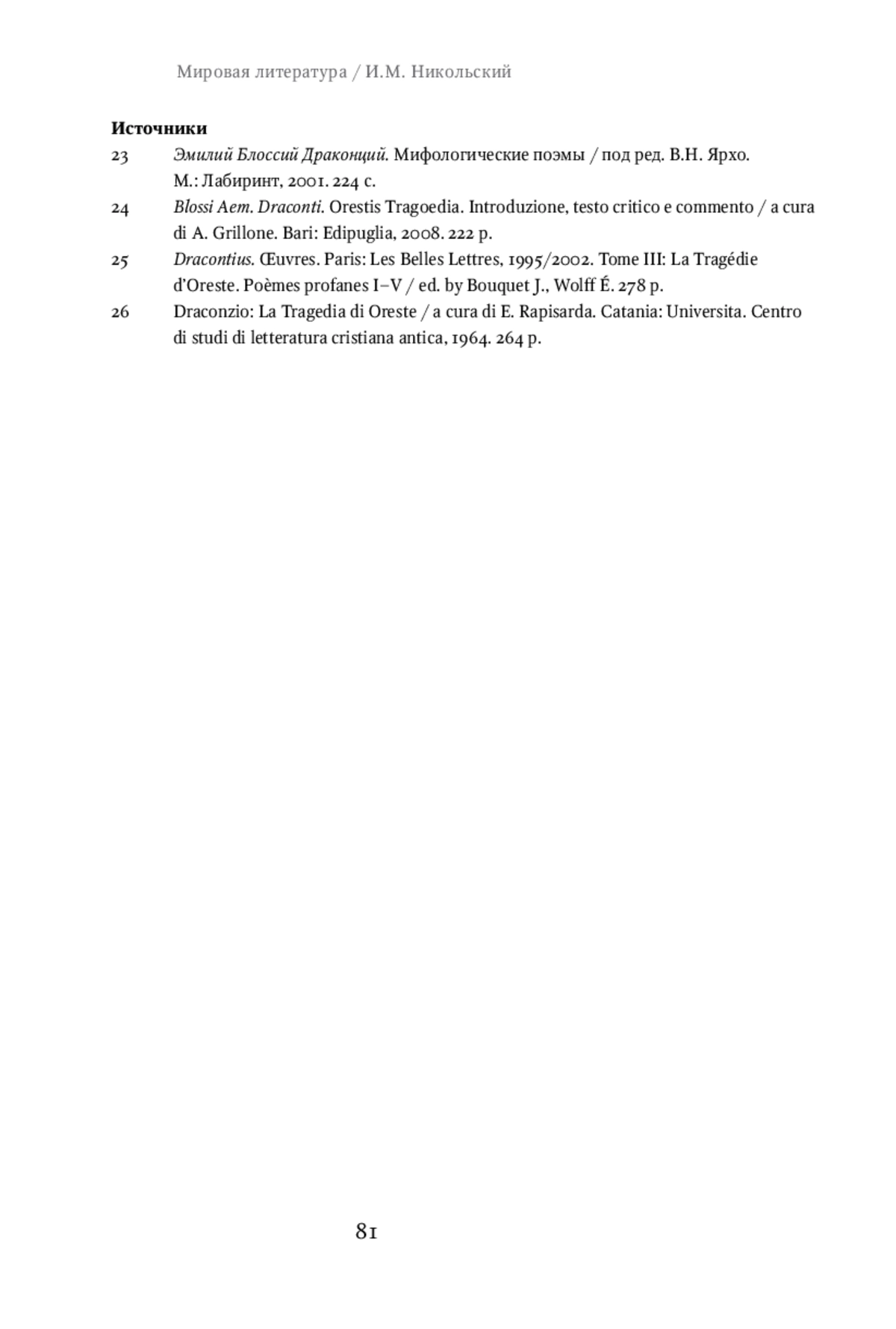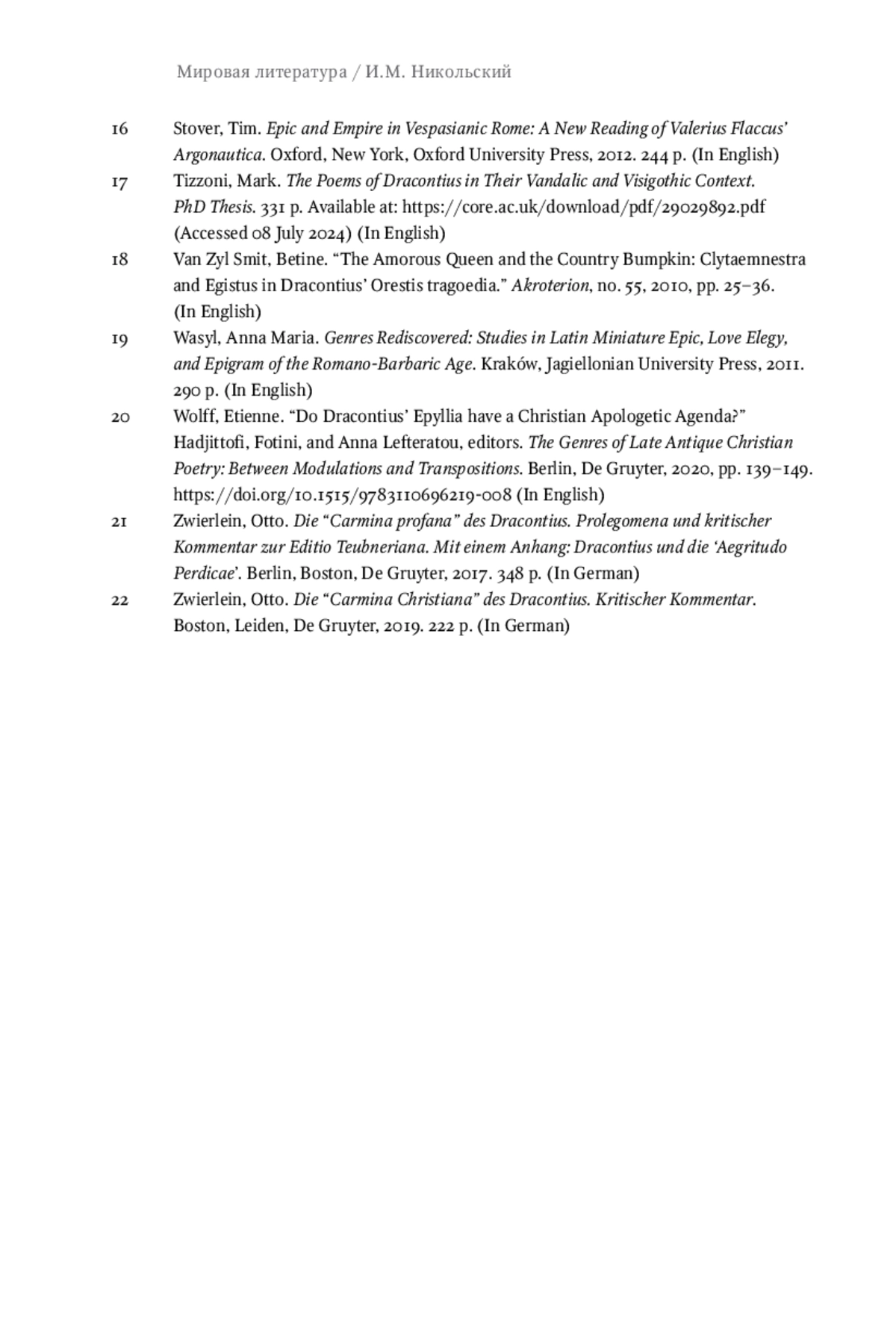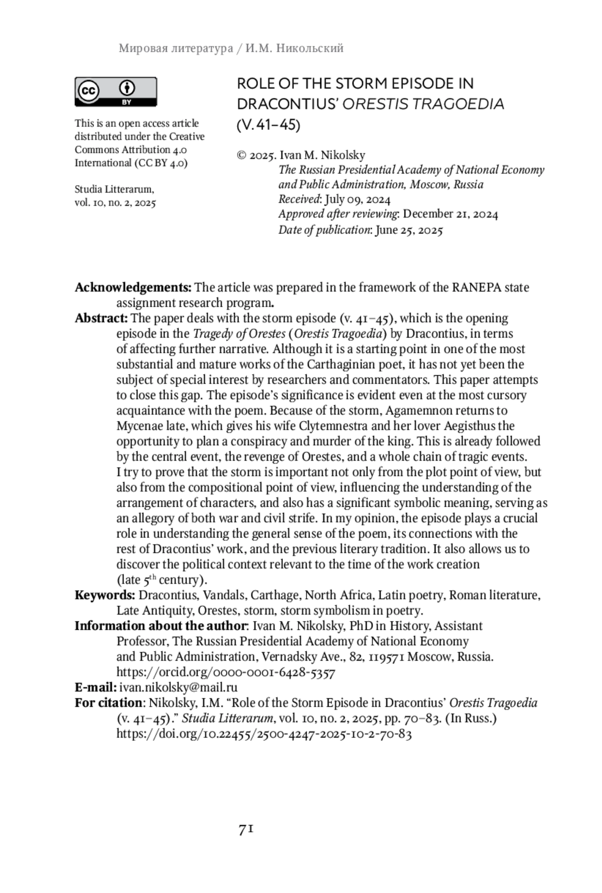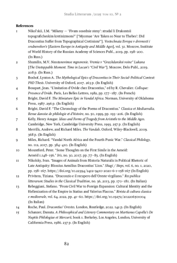 The paper deals with the storm episode (v. 41-45), which is the opening episode in the Tragedy of Orestes (Orestis Tragoedia) by Dracontius, in terms of affecting further narrative. Although it is a starting point in one of the most substantial and mature works of the Carthaginian poet, it has not yet been the subject of special interest by researchers and commentators. This paper attempts to close this gap. The episode’s significance is evident even at the most cursory acquaintance with the poem. Because of the storm, Agamemnon returns to Mycenae late, which gives his wife Clytemnestra and her lover Aegisthus the opportunity to plan a conspiracy and murder of the king. This is already followed by the central event, the revenge of Orestes, and a whole chain of tragic events. I try to prove that the storm is important not only from the plot point of view, but also from the compositional point of view, influencing the understanding of the arrangement of characters, and also has a significant symbolic meaning, serving as an allegory of both war and civil strife. In my opinion, the episode plays a crucial role in understanding the general sense of the poem, its connections with the rest of Dracontius’ work, and the previous literary tradition. It also allows us to discover the political context relevant to the time of the work creation (late 5th century).