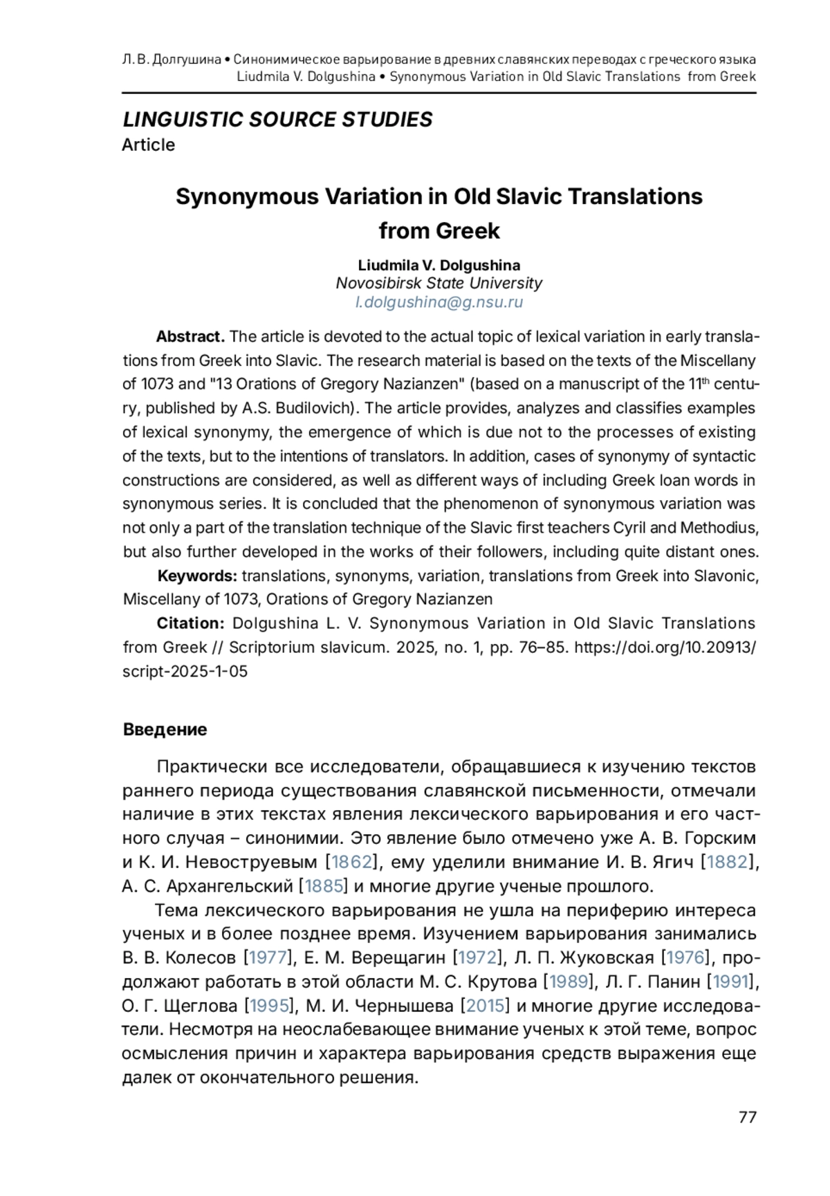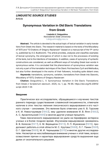 Статья посвящена актуальной теме лексического варьирования в ранних переводах с греческого на славянский язык. Цель исследования – показать, что использование синонимов как переводческая техника было свойственно не только Кириллу и Мефодию и их непосредственным ученикам, но и другим переводчикам раннего периода славянской письменности. Материалом исследования послужили тексты Изборника 1073 г. и сборника «XIII Слов Григория Богослова» (по рукописи XI в., изданной А. С. Будиловичем). В статье приводятся, анализируются и классифицируются примеры лексической синонимии, возникновение которой, с высокой долей вероятности, обусловлено не процессами бытования памятника, а интенциями переводчиков. Рассмотрены случаи синонимии синтаксических конструкций, а также разные способы включения грецизмов в синонимические ряды. Сделаны выводы, что явление синонимического варьирования являлось частью переводческой техники не только славянских первоучителей Кирилла и Мефодия, и в дальнейшем получило развитие в трудах их последователей, в том числе достаточно отдаленных.