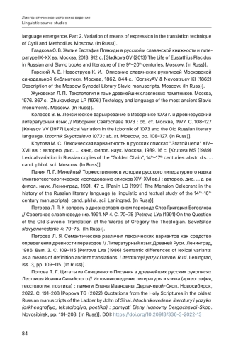 12. Попова Т. Г. Цитаты из Священного Писания в древнейших русских рукописях Лествицы Иоанна Синайского // Источниковедение литературы и языка (археография, текстология, поэтика) : памяти Елены Ивановны Дергачевой- Скоп. Новосибирск, 2022. С. 191-208