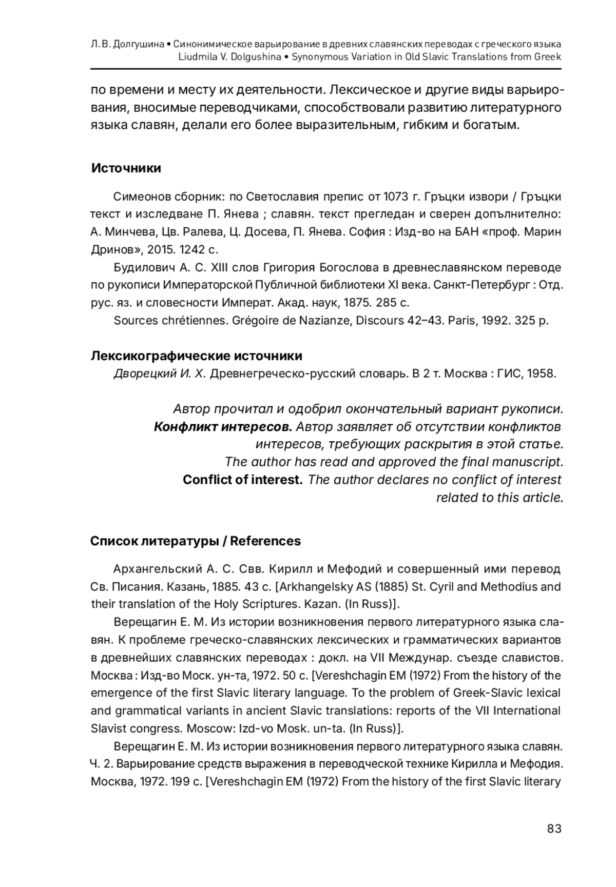 2. Верещагин Е. М. Из истории возникновения первого литературного языка славян. К проблеме греческо- славянских лексических и грамматических вариантов в древнейших славянских переводах : докл. на VII Междунар. съезде славистов. Москва : Изд-во Моск. ун-та, 1972. 50 с.