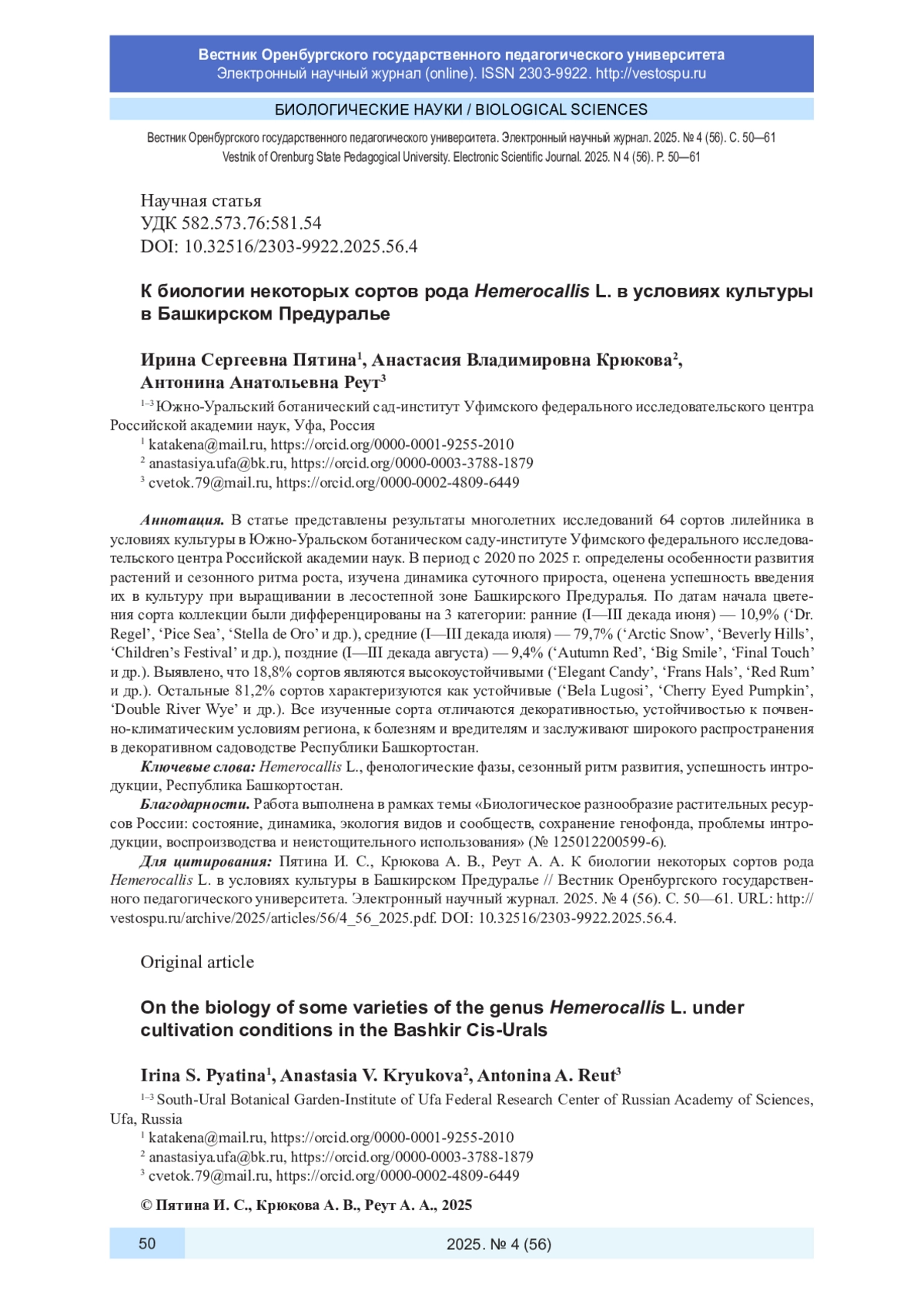 В статье представлены результаты многолетних исследований 64 сортов лилейника в условиях культуры в Южно-Уральском ботаническом саду-институте Уфимского федерального исследовательского центра Российской академии наук. В период с 2020 по 2025 г. определены особенности развития растений и сезонного ритма роста, изучена динамика суточного прироста, оценена успешность введения их в культуру при выращивании в лесостепной зоне Башкирского Предуралья. По датам начала цветения сорта коллекции были дифференцированы на 3 категории: ранние (I-III декада июня) - 10,9% (‘Dr. Regel’, ‘Pice Sea’, ‘Stella de Oro’ и др.), средние (I-III декада июля) - 79,7% (‘Arctic Snow’, ‘Beverly Hills’, ‘Children’s Festival’ и др.), поздние (I-III декада августа) - 9,4% (‘Autumn Red’, ‘Big Smile’, ‘Final Touch’ и др.). Выявлено, что 18,8% сортов являются высокоустойчивыми (‘Elegant Candy’, ‘Frans Hals’, ‘Red Rum’ и др.). Остальные 81,2% сортов характеризуются как устойчивые (‘Bela Lugosi’, ‘Cherry Eyed Pumpkin’, ‘Double River Wye’ и др.). Все изученные сорта отличаются декоративностью, устойчивостью к почвенно-климатическим условиям региона, к болезням и вредителям и заслуживают широкого распространения в декоративном садоводстве Республики Башкортостан.