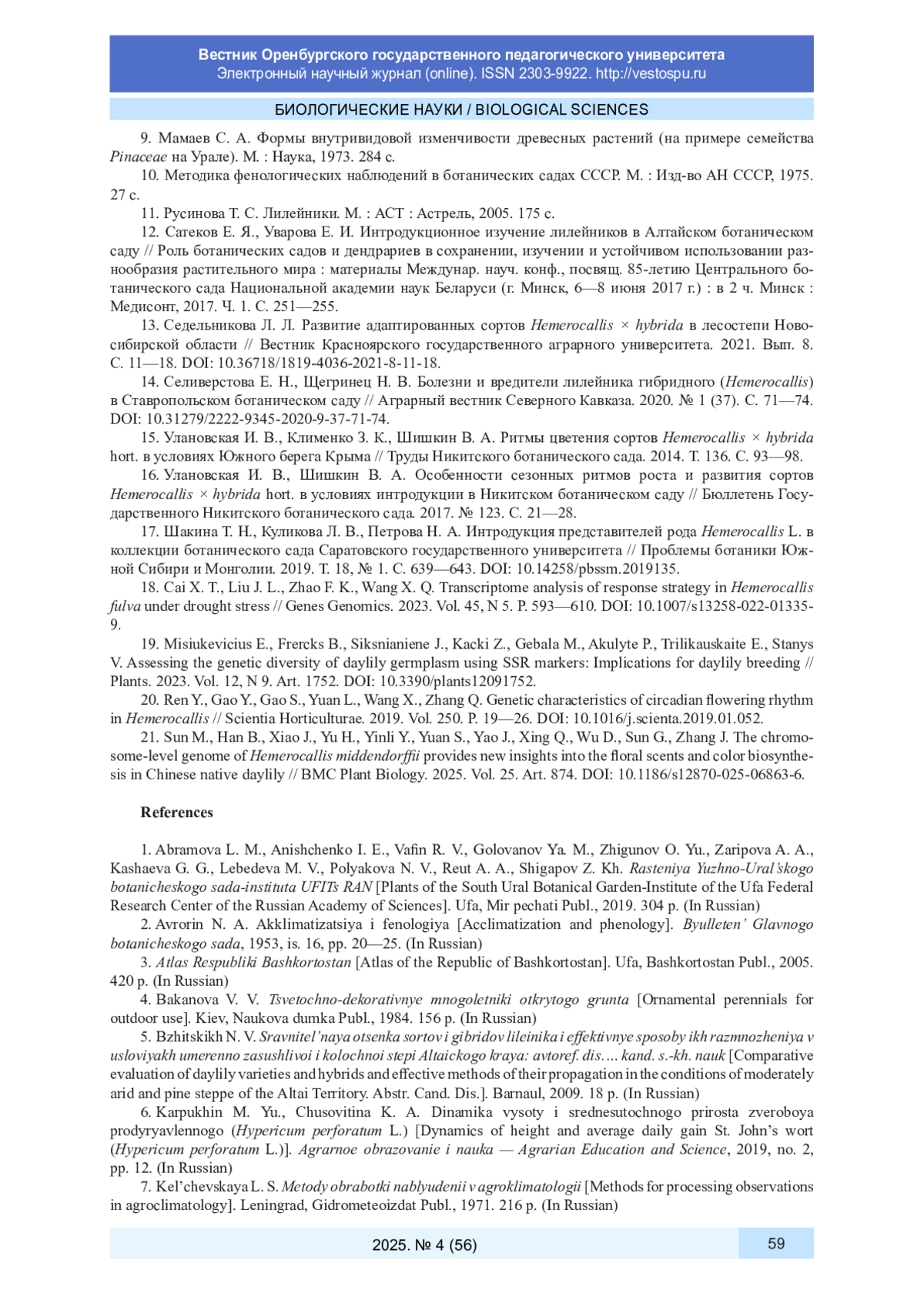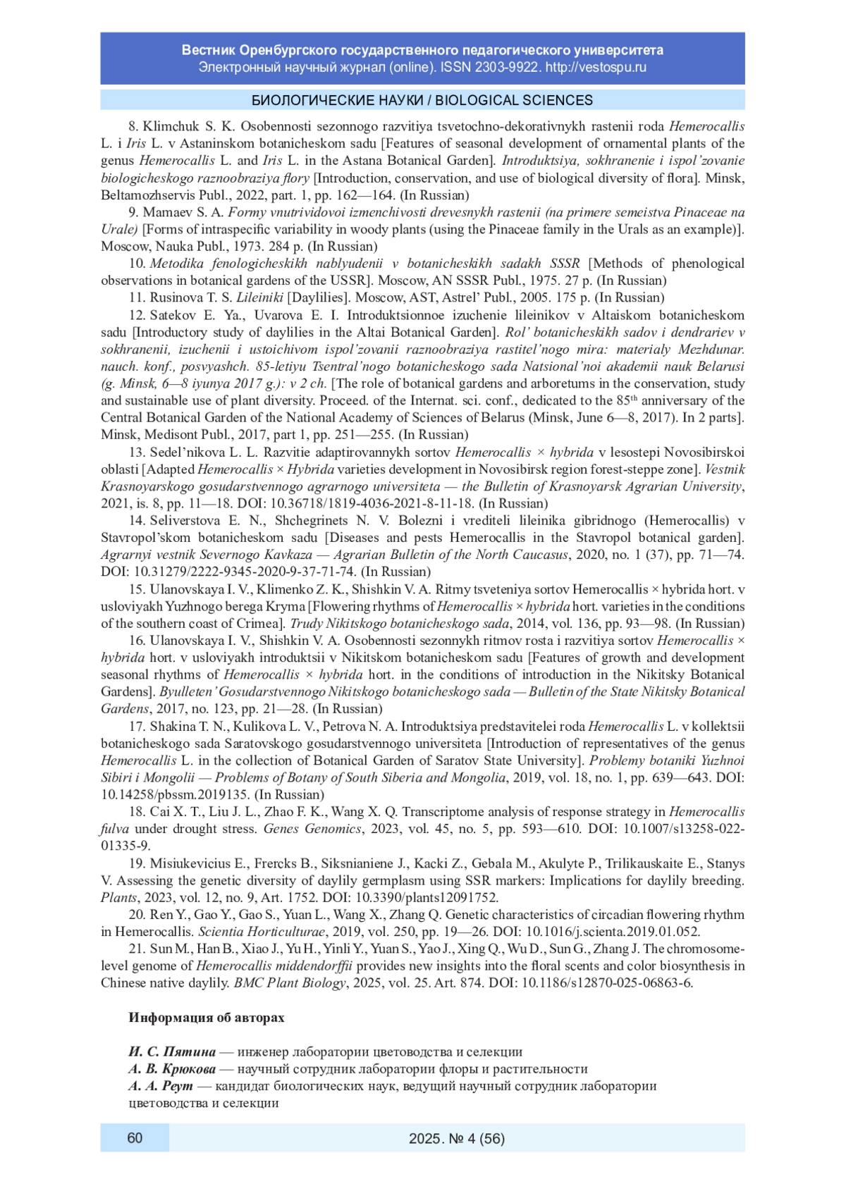 13. Седельникова Л. Л. Развитие адаптированных сортов Hemerocallis × hybrida в лесостепи Новосибирской области // Вестник Красноярского государственного аграрного университета. 2021. Вып. 8. С. 11-18. DOI: 10.36718/1819-4036-2021-8-11-18