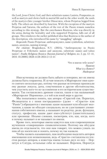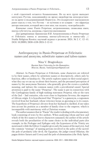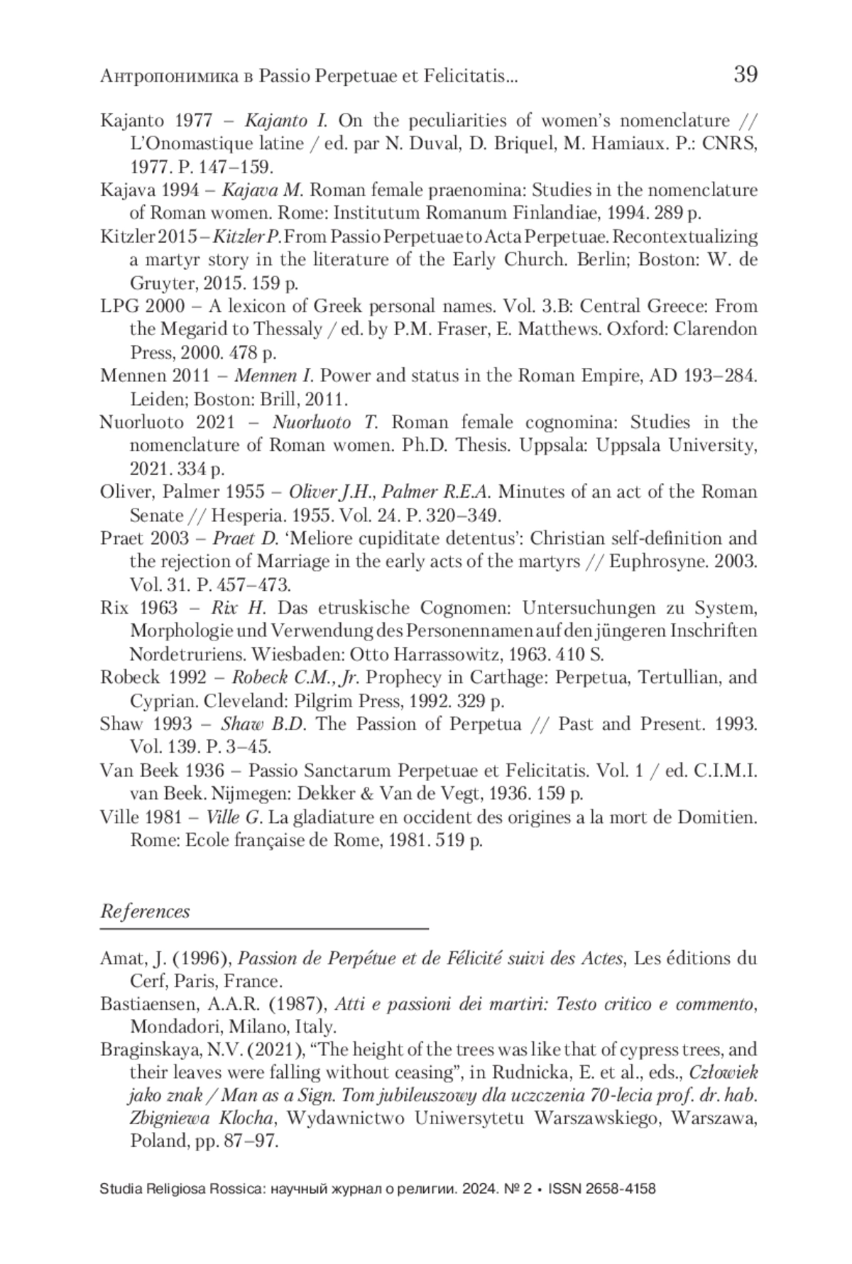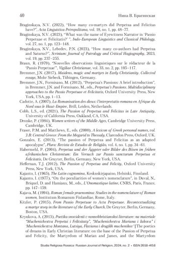 12. Braginskaya, Lebedev 2023 - Braginskaya N.V., Lebedev P.N. How many co-authors had Perpetua and Saturus? // Scrinium: Journal of Patrology and Critical Hagiography. 2023. Vol. 19. P. 237-255.