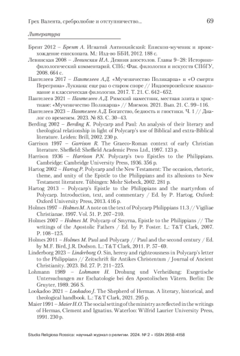4. Пантелеев 2021 - Пантелеев А.Д. Римский наместник, местная элита и христиане: «Мученичество Поликарпа» // Мнемон. 2021. Вып. 21. С. 99-116.