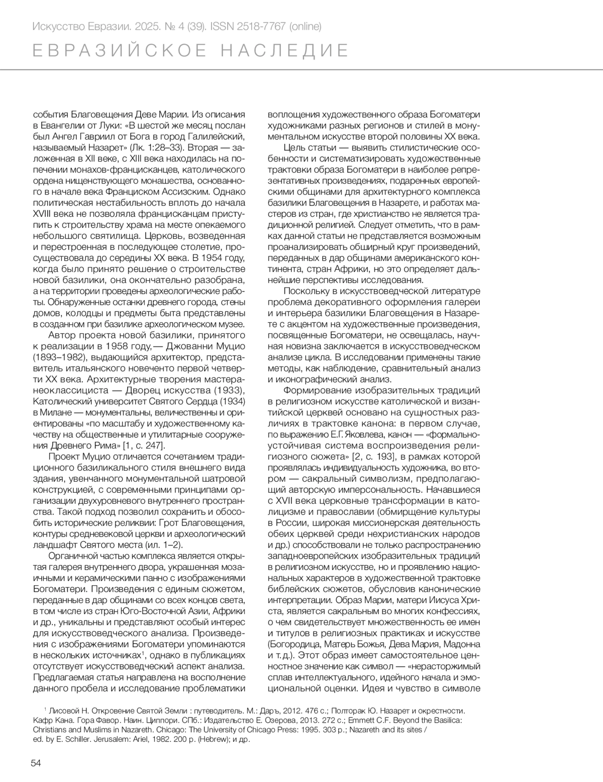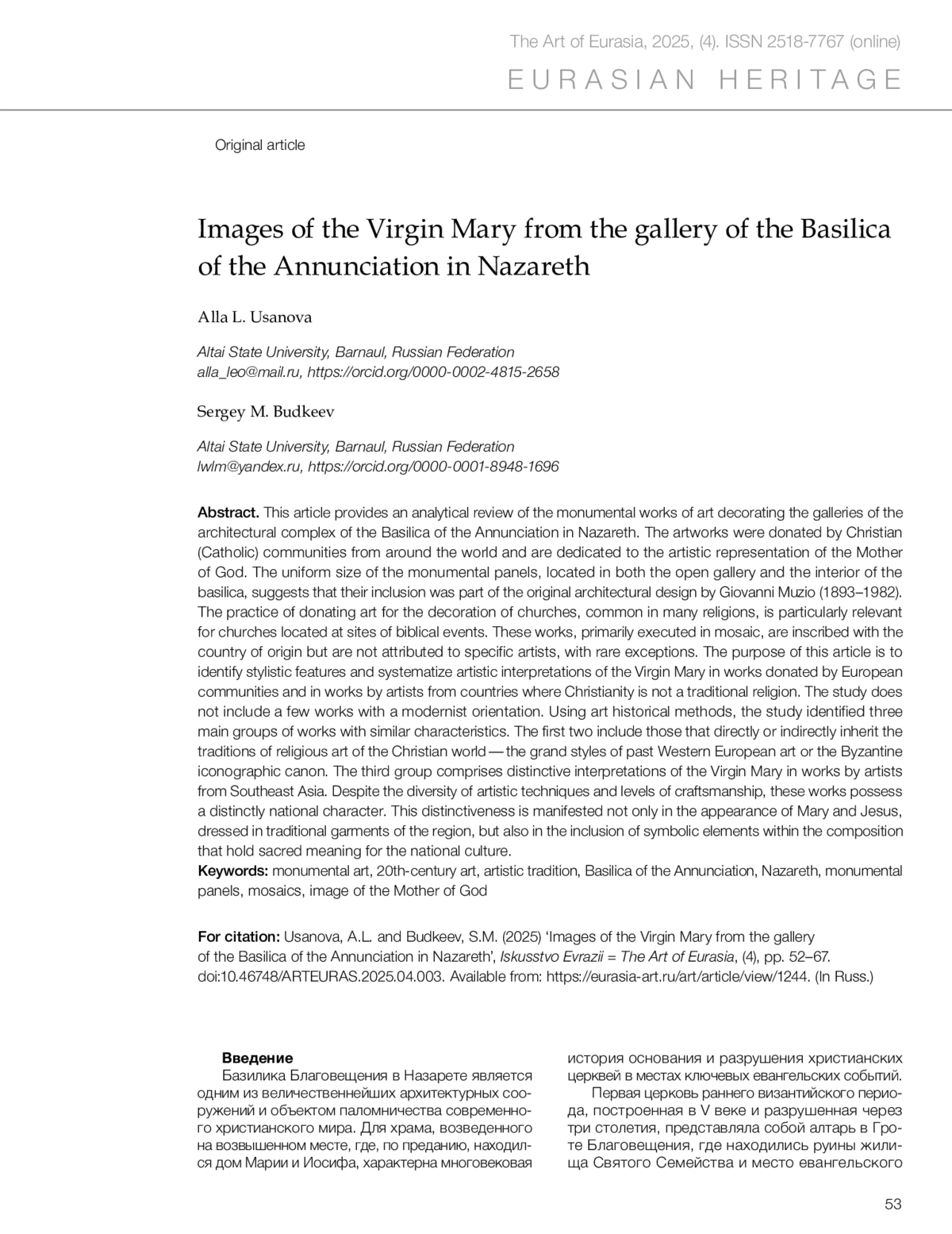 Усанова А.Л., Будкеев С.М. Образы Богоматери из галереи базилики Благовещения в Назарете // Искусство Евразии [Электронный журнал]. 2025. No 4 (39). С. 52–67.