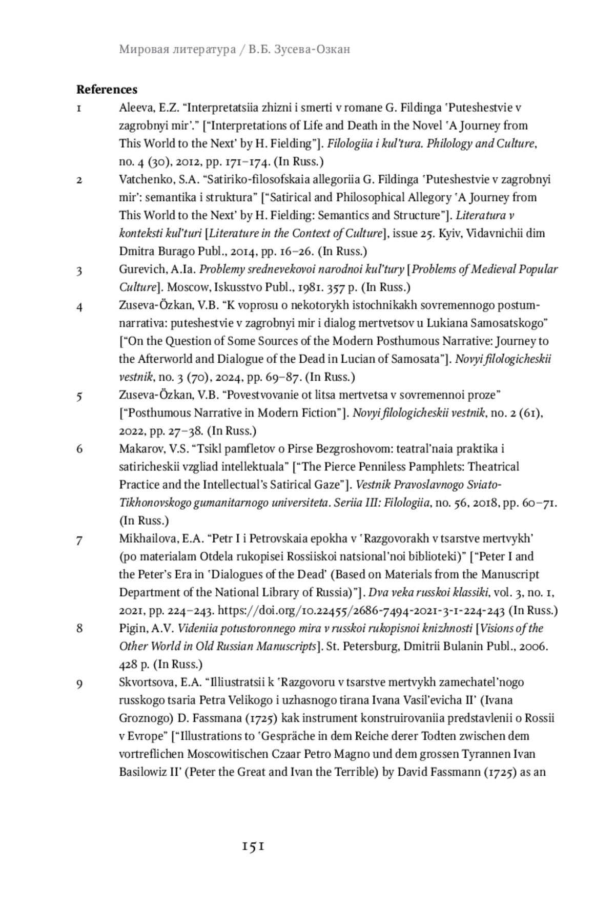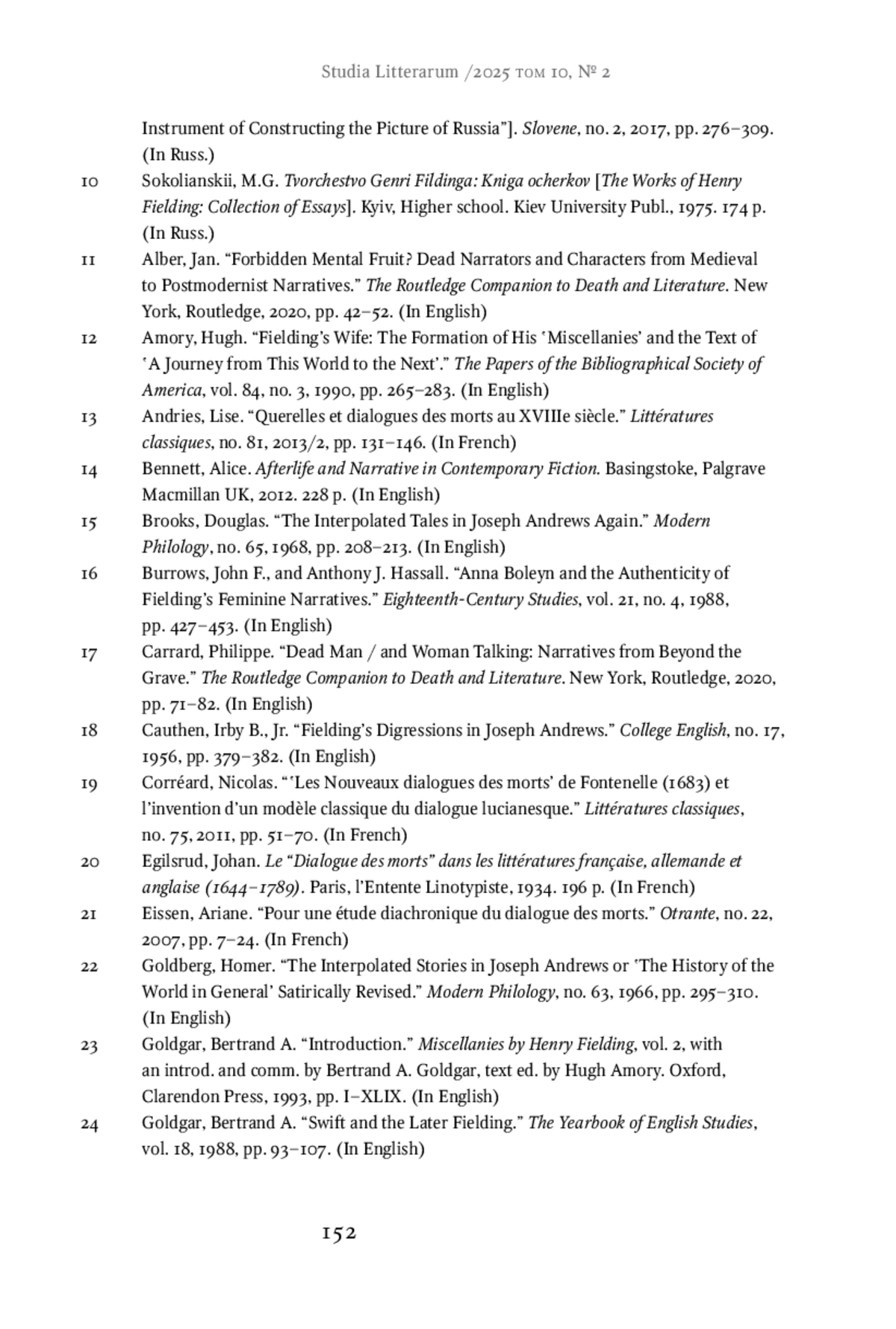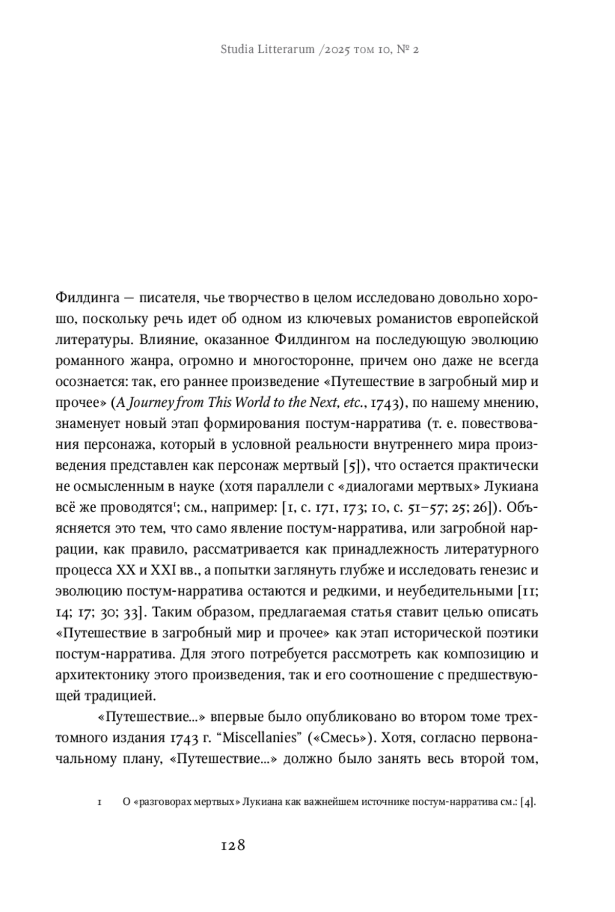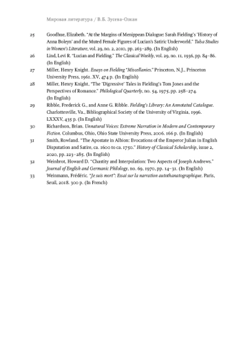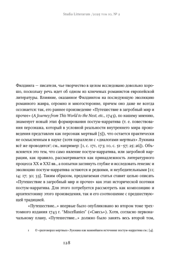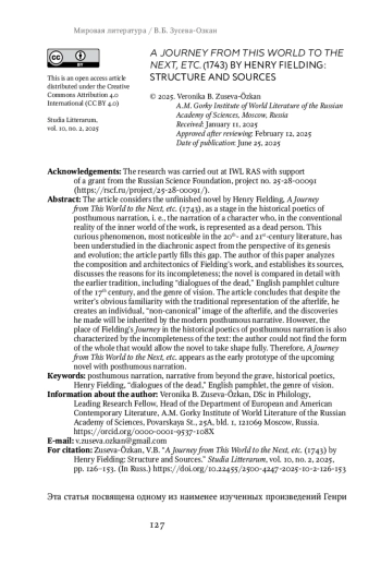 The article considers the unfinished novel by Henry Fielding, A Journey from This World to the Next, etc. (1743), as a stage in the historical poetics of posthumous narration, i. e., the narration of a character who, in the conventional reality of the inner world of the work, is represented as a dead person. This curious phenomenon, most noticeable in the 20th- and 21st-century literature, has been understudied in the diachronic aspect from the perspective of its genesis and evolution; the article partly fills this gap. The author of this paper analyzes the composition and architectonics of Fielding’s work, and establishes its sources, discusses the reasons for its incompleteness; the novel is compared in detail with the earlier tradition, including “dialogues of the dead,” English pamphlet culture of the 17th century, and the genre of vision. The article concludes that despite the writer’s obvious familiarity with the traditional representation of the afterlife, he creates an individual, “non-canonical” image of the afterlife, and the discoveries he made will be inherited by the modern posthumous narrative. However, the place of Fielding’s Journey in the historical poetics of posthumous narration is also characterized by the incompleteness of the text: the author could not find the form of the whole that would allow the novel to take shape fully. Therefore, A Journey from This World to the Next, etc. appears as the early prototype of the upcoming novel with posthumous narration.