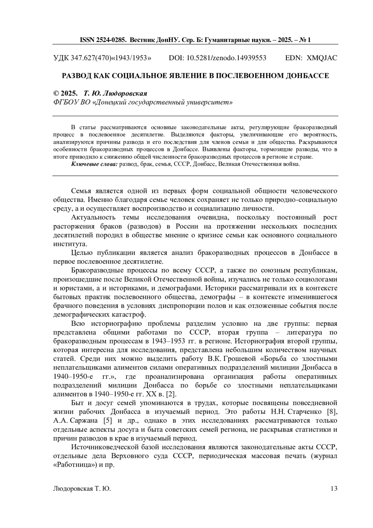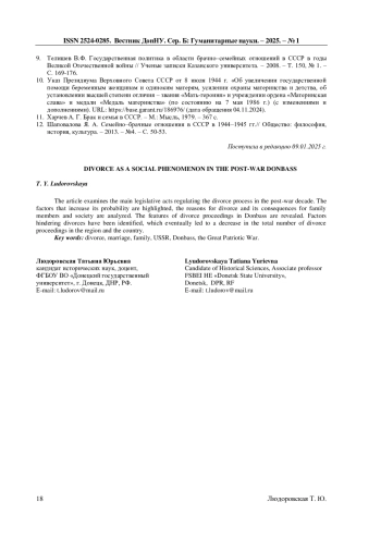 В статье рассматриваются основные законодательные акты, регулирующие бракоразводный процесс в послевоенное десятилетие. Выделяются факторы, увеличивающие его вероятность, анализируются причины развода и его последствия для членов семьи и для общества. Раскрываются особенности бракоразводных процессов в Донбассе. Выявлены факторы, тормозящие разводы, что в итоге приводило к снижению общей численности бракоразводных процессов в регионе и стране.