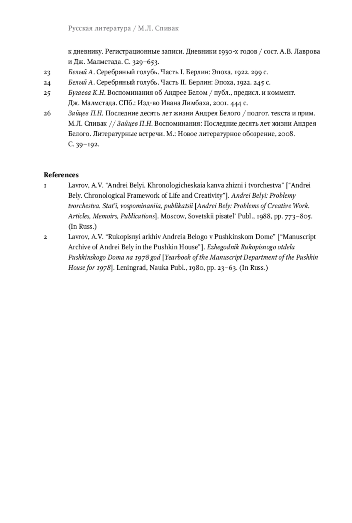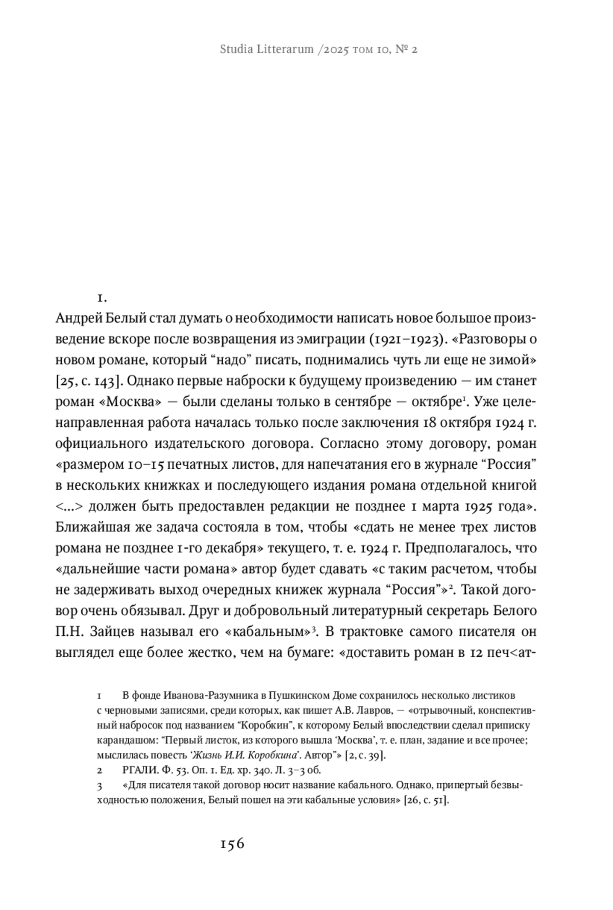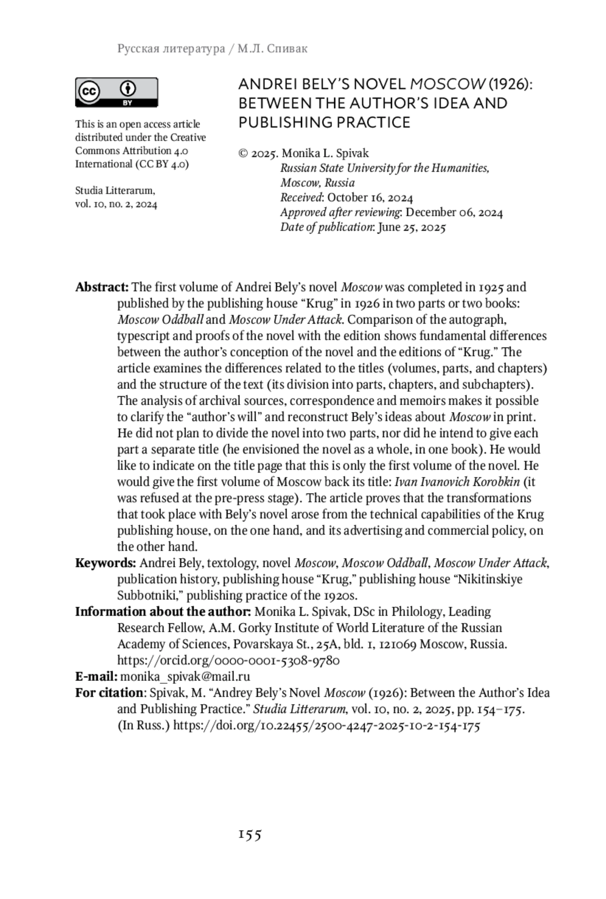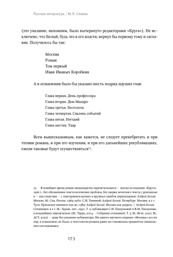 The first volume of Andrei Bely’s novel Moscow was completed in 1925 and published by the publishing house “Krug” in 1926 in two parts or two books: Moscow Oddball and Moscow Under Attack. Comparison of the autograph, typescript and proofs of the novel with the edition shows fundamental differences between the author’s conception of the novel and the editions of “Krug.” The article examines the differences related to the titles (volumes, parts, and chapters) and the structure of the text (its division into parts, chapters, and subchapters). The analysis of archival sources, correspondence and memoirs makes it possible to clarify the “author’s will” and reconstruct Bely’s ideas about Moscow in print. He did not plan to divide the novel into two parts, nor did he intend to give each part a separate title (he envisioned the novel as a whole, in one book). He would like to indicate on the title page that this is only the first volume of the novel. He would give the first volume of Moscow back its title: Ivan Ivanovich Korobkin (it was refused at the pre-press stage). The article proves that the transformations that took place with Bely’s novel arose from the technical capabilities of the Krug publishing house, on the one hand, and its advertising and commercial policy, on the other hand.
