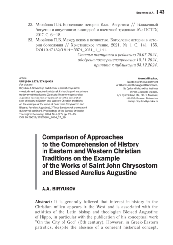 Принято считать, что интерес к истории в христианской среде появляется на Западе и связан с деятельностью латинского епископа и богослова блаженного Августина Иппонского, в частности с выходом его концептуального труда «О граде Божием» (V век). Однако в греко-восточной патристике, несмотря на отсутствие целостной исторической концепции, история также не была обойдена вниманием. Одним из восточных отцов Церкви, в чьих трудах можно найти стремление к осмыслению исторического процесса, является святитель Иоанн Златоуст, являющийся современником блаженного Аврелия Августина. В статье анализируются основные произведения указанных богословов, содержащие попытки осмысления исторического процесса. В ходе анализа сравниваются космологические концепции, начало исторического процесса, проблема зла, эсхатологические воззрения как финал человеческой истории. Автором делается вывод о том, что ключевое различие между подходами двух мыслителей пролегает в отношении осмысления значимости свободы воли человека в мировом историческом процессе.