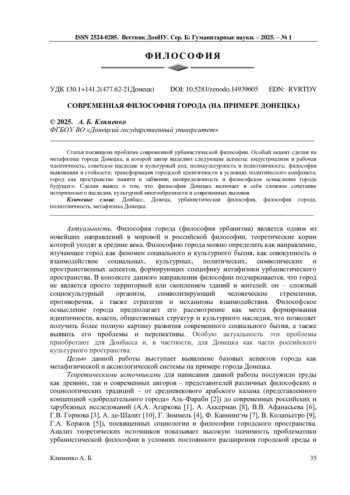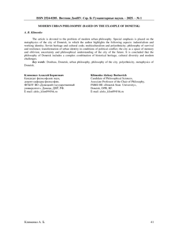 Статья посвящена проблеме современной урбанистической философии. Особый акцент сделан на метафизике города Донецка, в которой автор выделяет следующие аспекты: индустриализм и рабочая идентичность; советское наследие и культурный код; поликультурность и полиэтничность; философия выживания и стойкости; трансформация городской идентичности в условиях политического конфликта; город как пространство памяти и забвения; неопределенность и философское осмысление города будущего. Сделан вывод о том, что философия Донецка включает в себя сложное сочетание исторического наследия, культурной многообразности и современных вызовов.