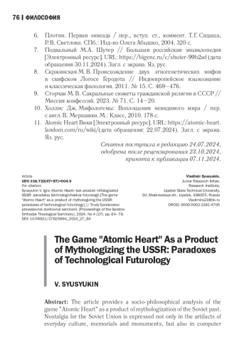 В статье проводится социально-философский анализ игры «Atomic Heart» как продукта мифологизации советского прошлого. Ностальгия по Советскому Союзу выражается не только в артефактах культуры повседневности, мемориалах и памятниках, но и в компьютерных играх. Исследования игровой индустрии - одно из самых перспективных и востребованных направлений современной гуманитарной науки. В ходе исследования выясняется, что игра базируется на нескольких мифологемах, важнейшие из которых - мифологемы богостроительства и коллективного разума. Технологическая футурология игры позволяет скрыть данные нарративы за образами СССР будущего, в пространстве которого пользователь знакомится с сюжетной линией игры. В завершение автор делает вывод о том, что синтез советской эстетики, мифологических нарративов и образов технологий будущего неизбежно помещает пользователя в пространство моральных дилемм.